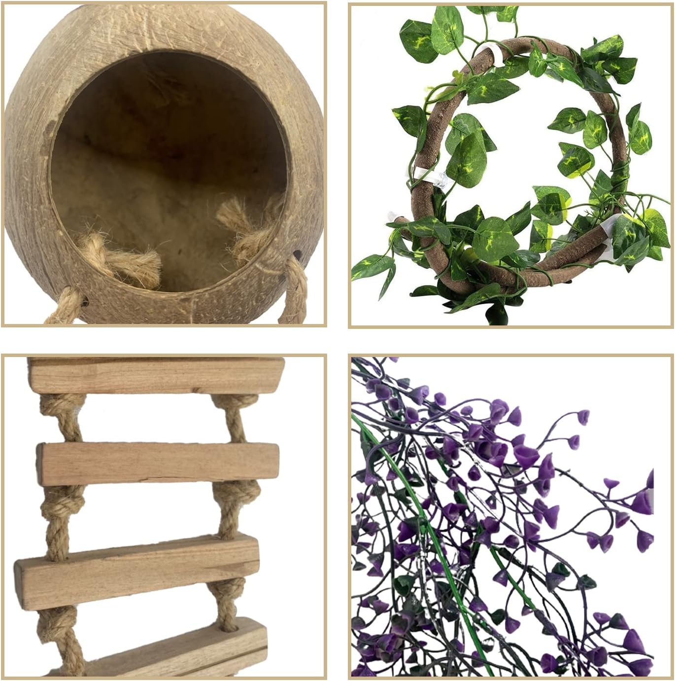 Wooden rope Ladder design: Coconut shell with wooden rope ladder design, thick wooden rope ladder and coconut fiber to help pets muscle building, tattooed geckos like to swing and climb to exercise their balance
