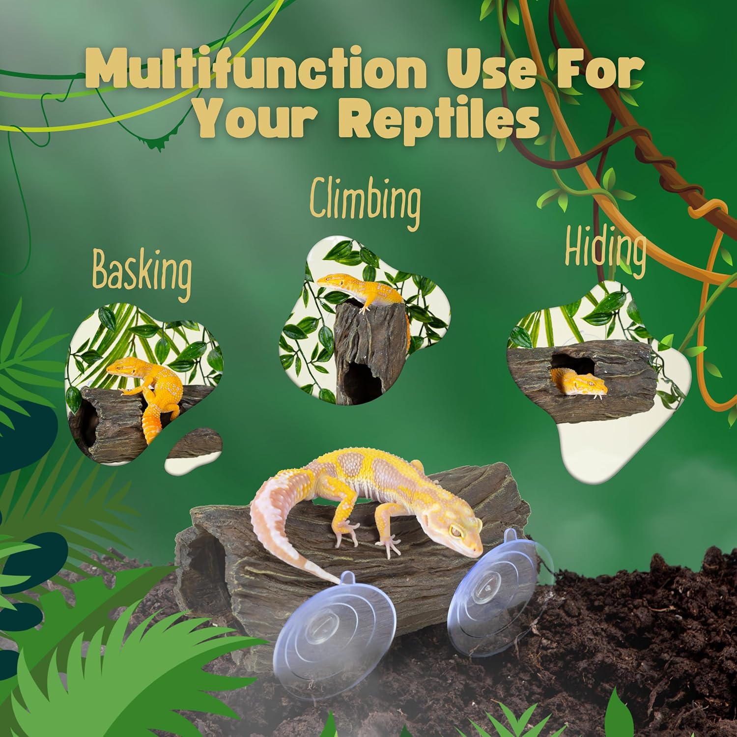 Reptile Hideout: Our reptile hideout offers a realistic tree trunk look, perfect for geckos and other reptiles. Designed with two powerful suction cups, it ensures stability on glass and acrylic terrariums, holding up to 2.2 lbs securely.