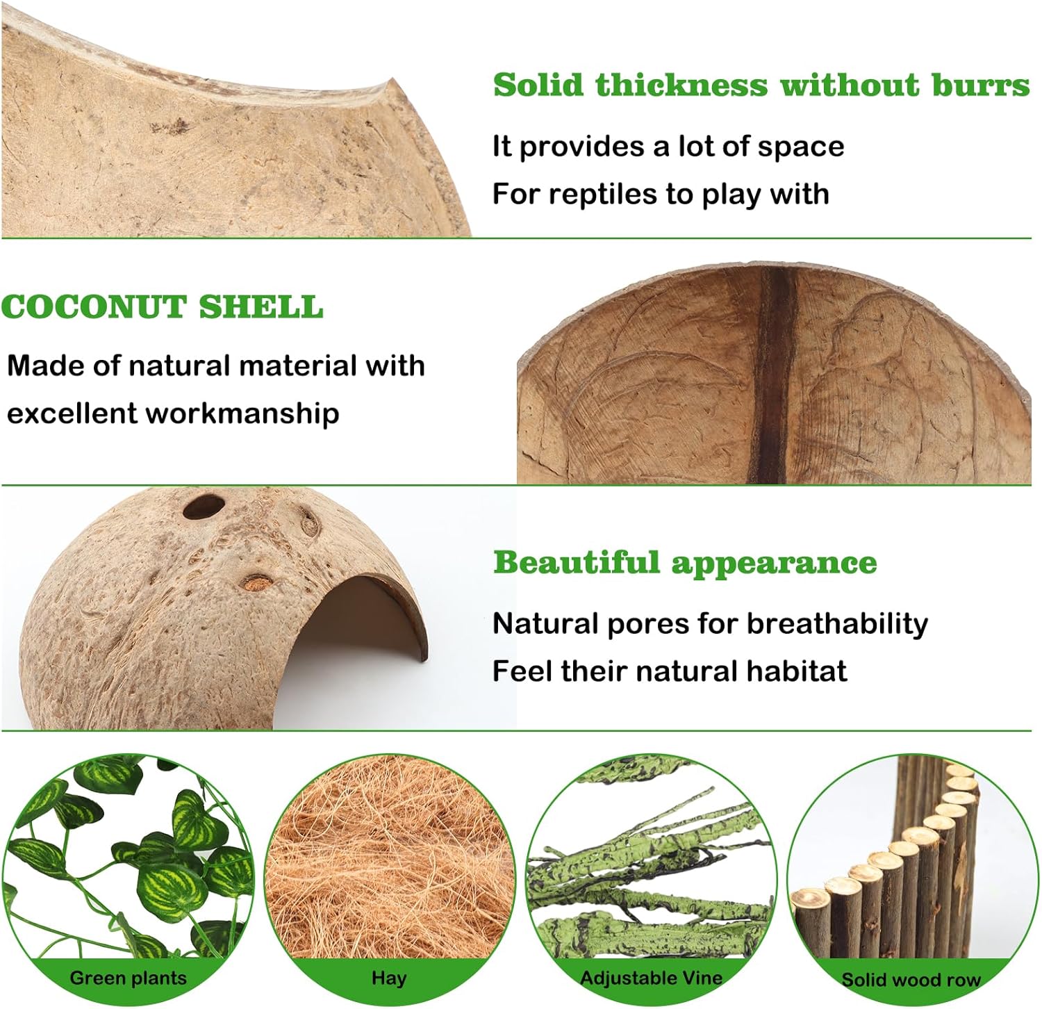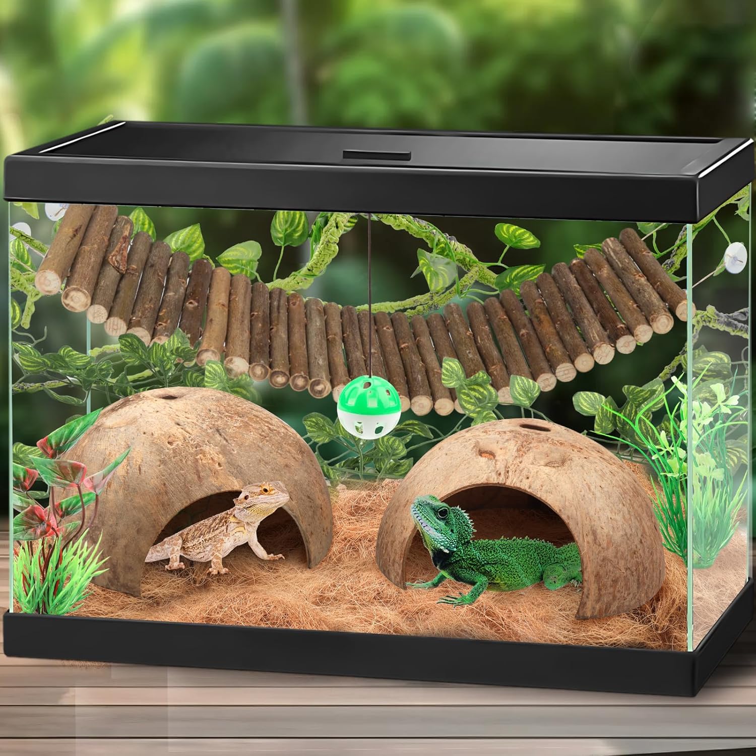 Crested Gecko Tank Accessories, Reptile Climbing Vines Hanging Plants with Coconut Shells Bridge Hideout Hermit Crab Decor for Bearded Dragon Lizard Chameleon Gecko Turtle Snake