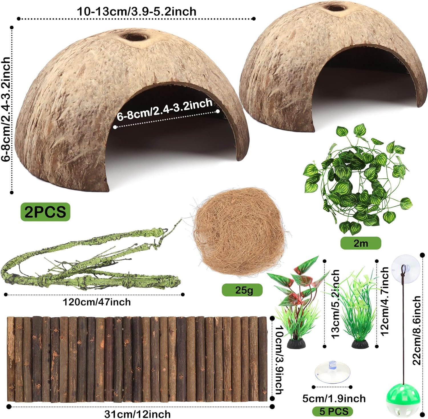 I ordered this for my hamsterâs enclosures, and they love it! The set comes with two coconuts, coconut husk, bendable wooden bridge, plastic plants, and a bendable foam vine. The coconuts, wooden bridge and plastic plants are all great, but Iâm a little wary of the foam vine. Aside from that, itâs been used a lot by them.