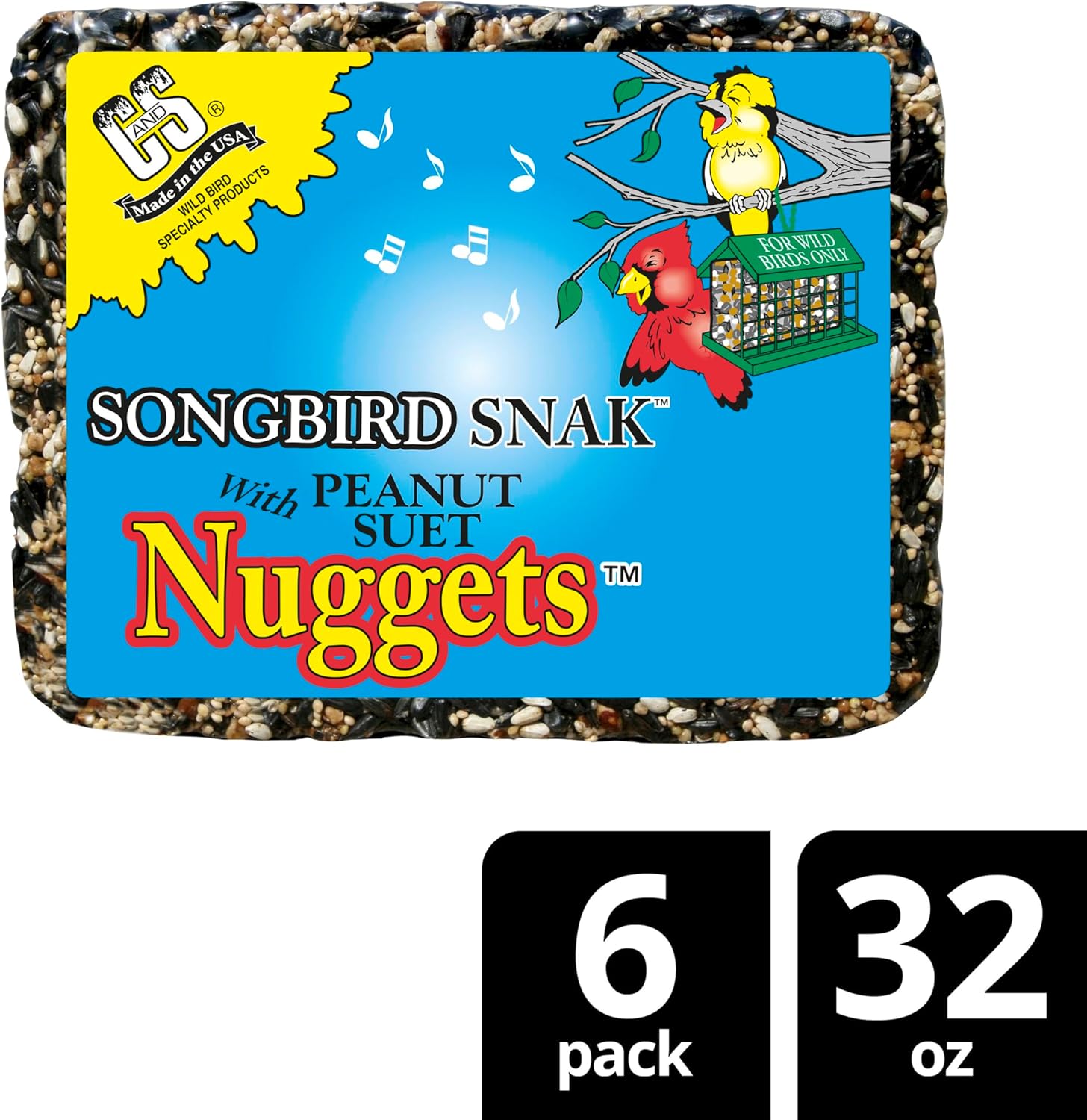 C&S Songbird Snak with Peanut Suet Nuggets, Suet Seed Cakes for Wild Birds, 32 ounces, Pack of 6