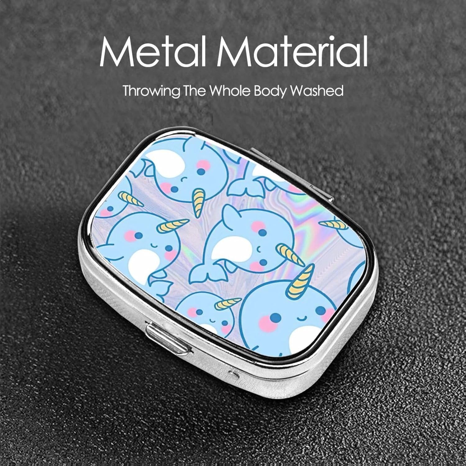 Spring Locking Buckle:Cute Fish Print Medicine Box Is Made Of High-Quality, High Gloss Metal Structure, With Reliable Buckle Rings And Spring Locking Buckles. Press The Button To Open The Lid. Internally Divided Into Two Compartments To Maintain The Good Condition Of The Medication.