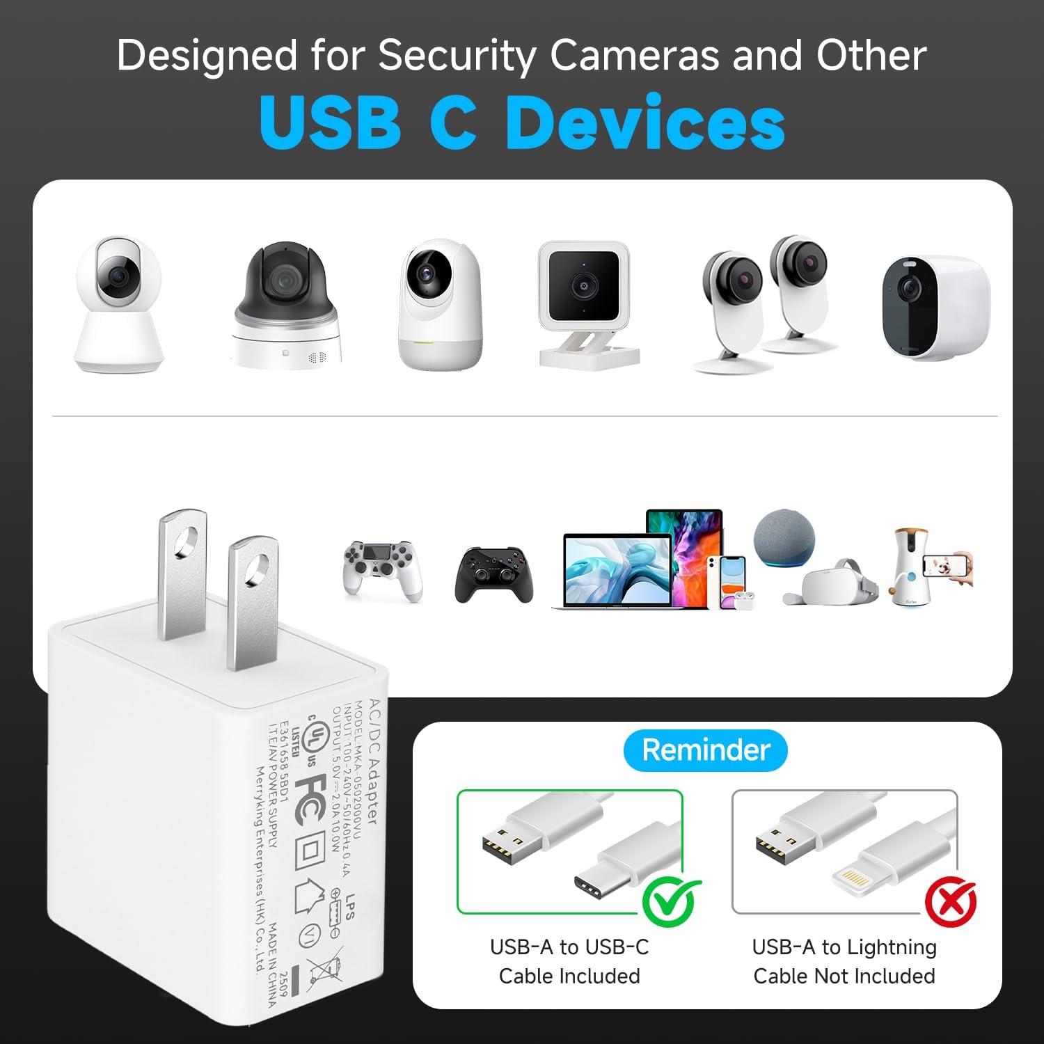 DC 5V 2A 10W USB Wall Charger with 10ft/3M USB C Cable, AC Adapter for Type-C Enabled Home Security Cameras, Power Charging & Power Supply for More USB-C Devices-White