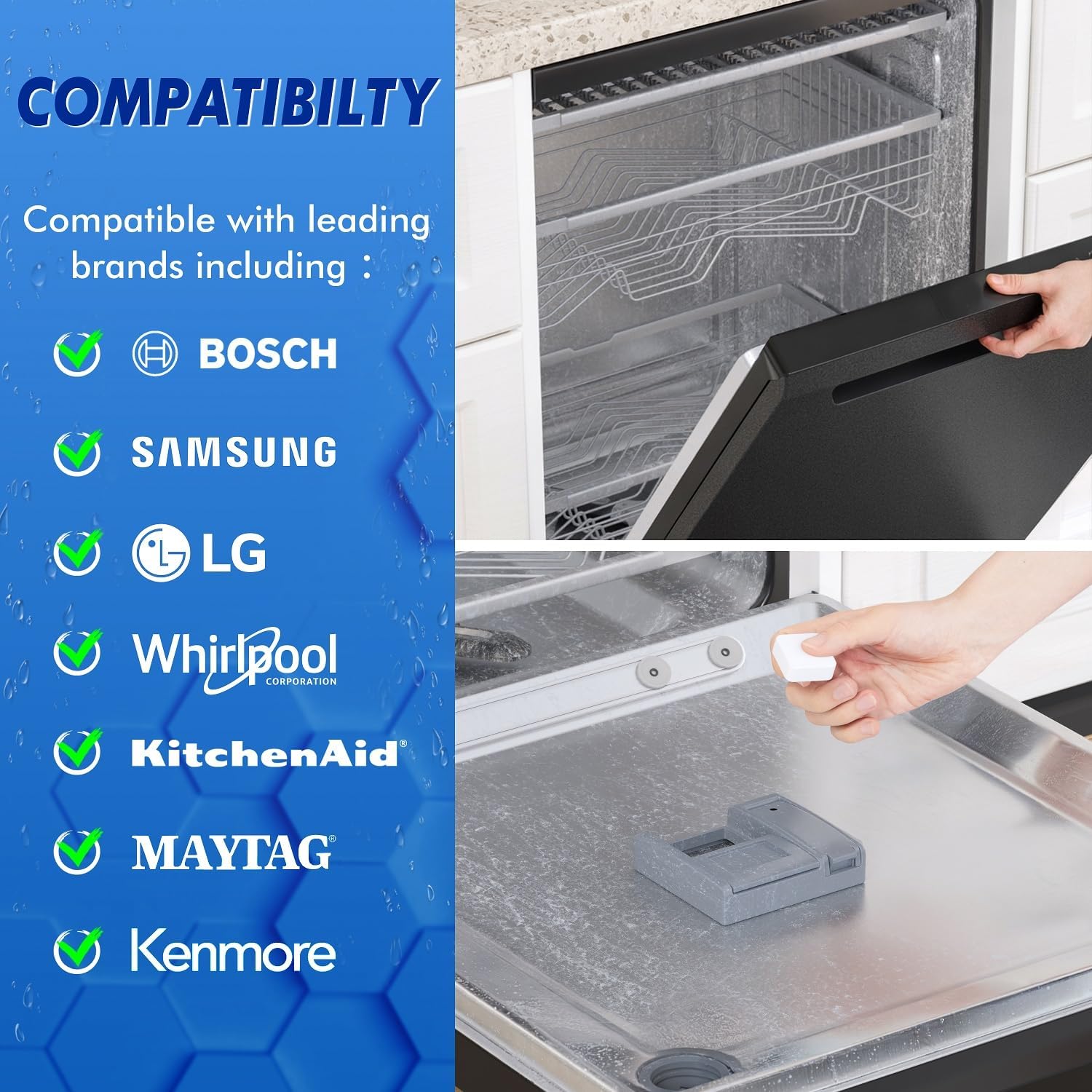 Septic-safe, plastic/stainless steel friendly dishwasher cleaning tablets. Compatible with leading brands including Bosch, Samsung, LG, Whirlpool, KitchenAid, Maytag, Kenmore and more.