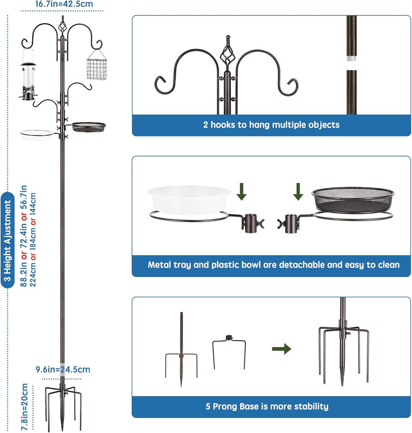EASY TO INSTALL BIRD FEEDER POLE: You can loosen and tighten the nuts manually, and you can easily adjust the components to any desired position. No tools are required to install bird feeding station! There are five prong bases in total, making it easier to fix this bird feeder extension pole. The bird feeding net tray and water bowl can be separated, and it is very convenient to clean. This wild bird feeder hanging is 91 inches tall and can hang more things