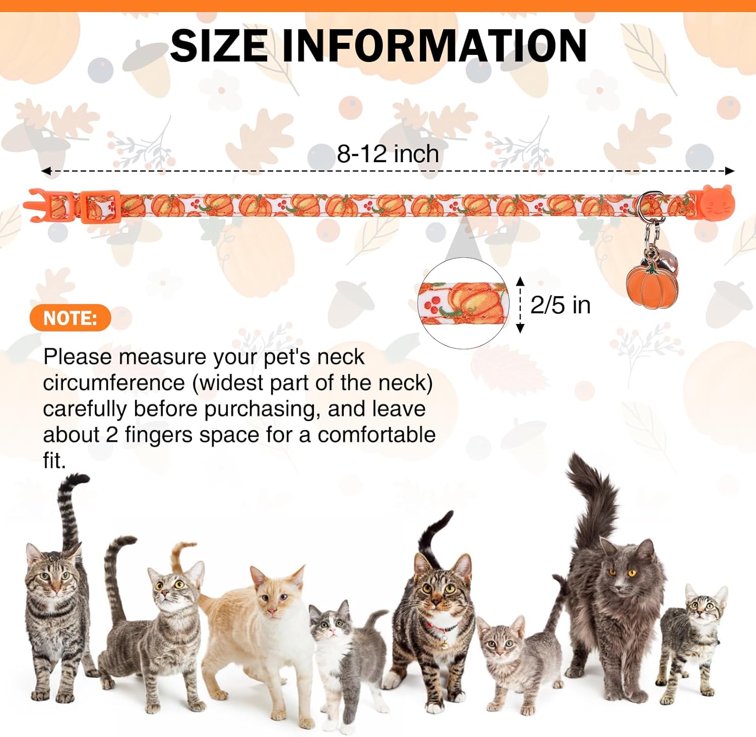 ADJUSTABLE: Each collar is 2/5 inches wide and adjustable from 8-12 inches, suitable for most cats and kittens. We advise customers to measure their pet’s neck circumference before purchase. Please adjust the length to the correct size to minimize the risk of catching the chin and startling your cat.