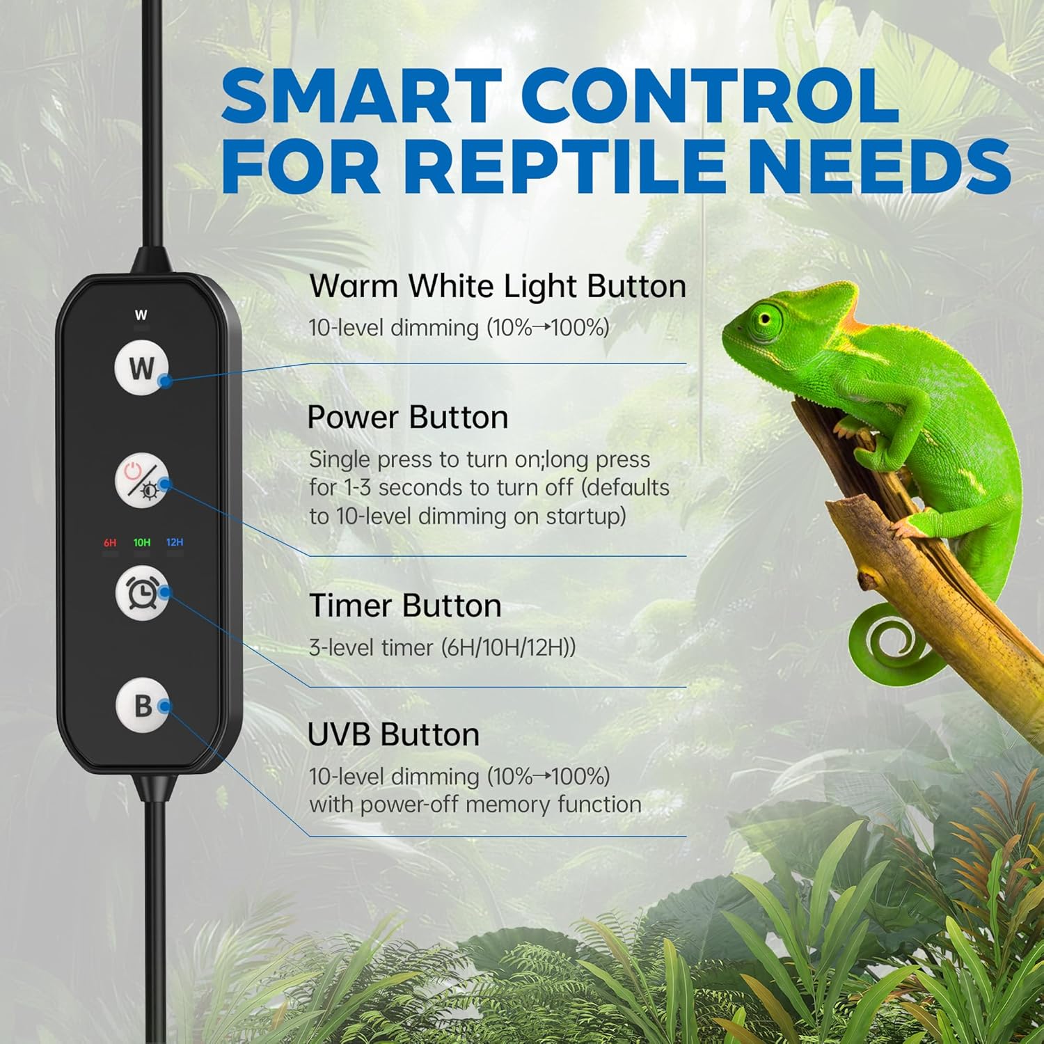 [Stepless Dimming, Precise Control] This versatile reptile UVB lamp offers stepless dimming from 1% to 100%, allowing for precise control based on species, age, and tank size. As an essential UVB lamp for professional-grade care, it helps prevent overexposure while ensuring your pet receives adequate light. This reptile UVB light is compatible with all chameleon cage accessories, allowing for unparalleled adjustability.