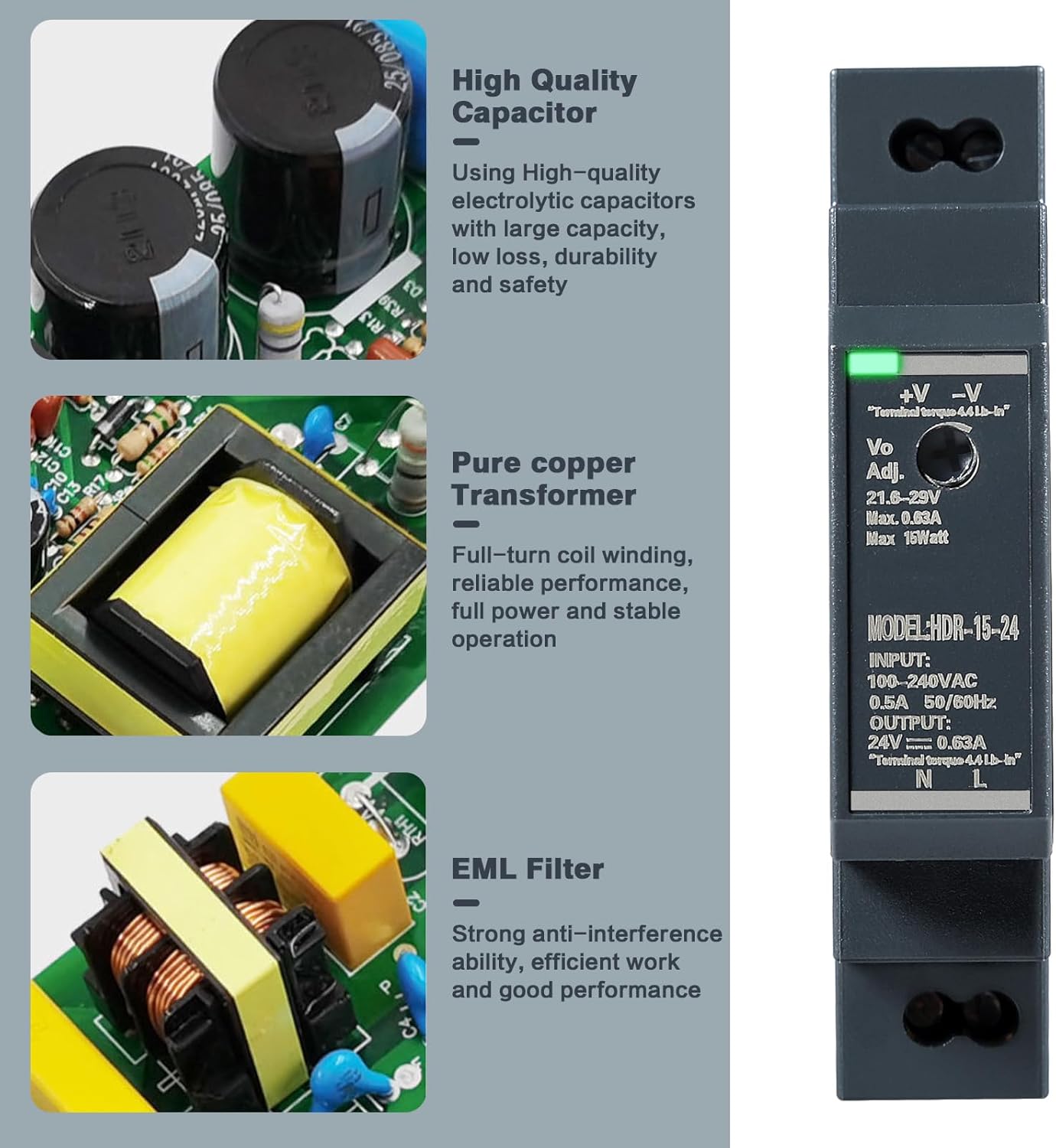 2 reviews for DIN Rail Power Supply, 15W 24VDC 0.63A Switching Power Supply with Overload Protection and Stable DC Output (HDR-15-24)