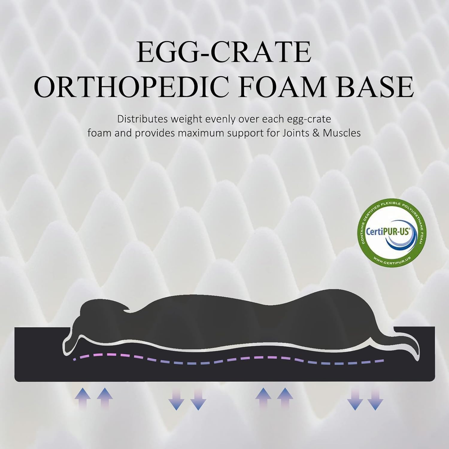 The base consists of a 3 inch egg crate foam that provides pets the ultimate sleep stability experience while tear-resistant surface provides that one of a kind durable experience with superior overall comfort that lasts.