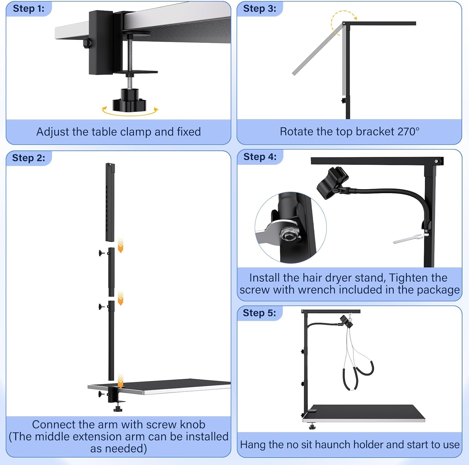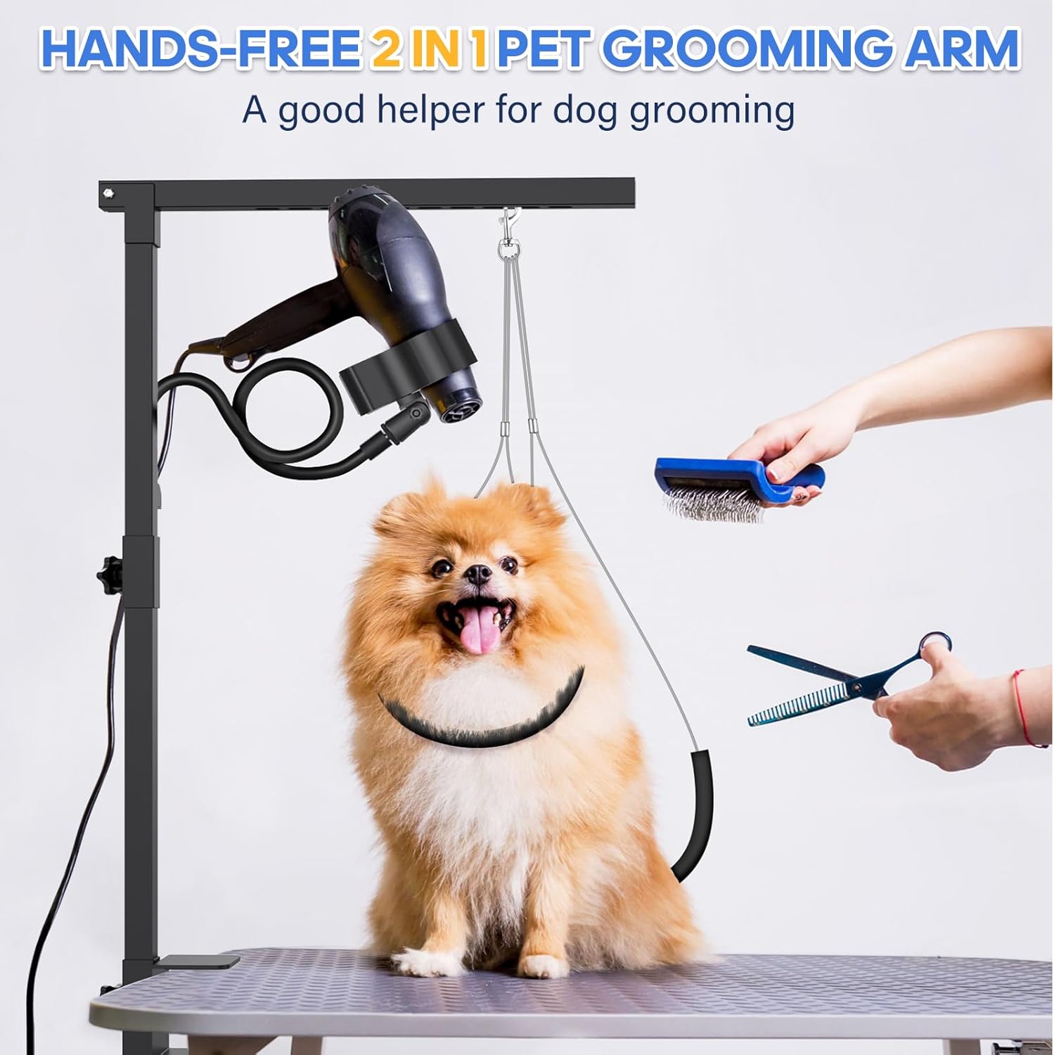 Professional Set Elevate Pet Grooming with Ease – Our versatile dog grooming arm tailored for various pet care needs, ideal for hair cutting, nail trimming, bathing, and drying. Equipped with professional hair dryer hose holder, an extra hand when you need it most, give you the freedom to move around, with less fuss and more actionand. The no sit haunch holder is a perfect dog restraints for grooming which help control excessive movement of an excited pet.