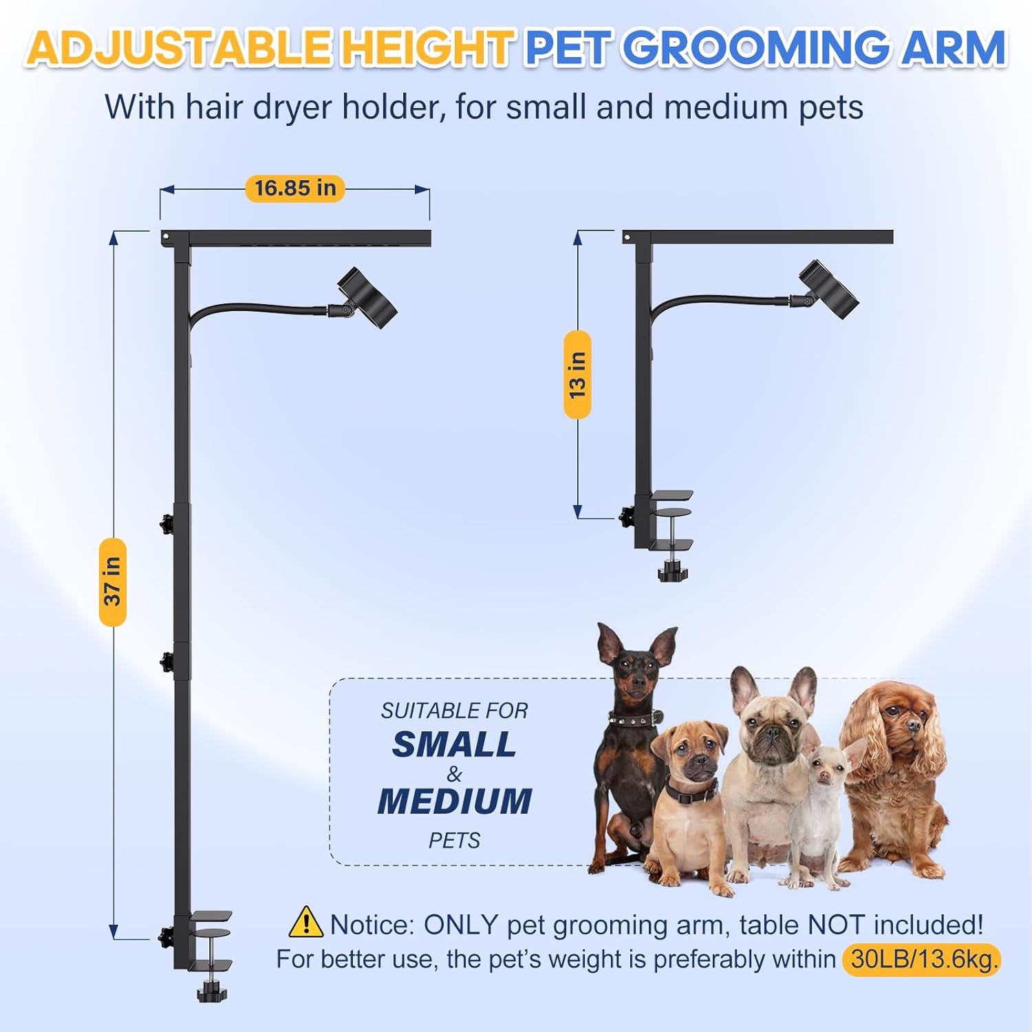 37 inches Adjustable & Foldable Grooming Arm – The AYBBSHOW dog grooming arm can adjustable from 16.5 inches to a maximum of 37 inches, 5 inches more adjustable height than others. Our grooming table arm is suitable for small and medium dogs, cats under 30 lbs.