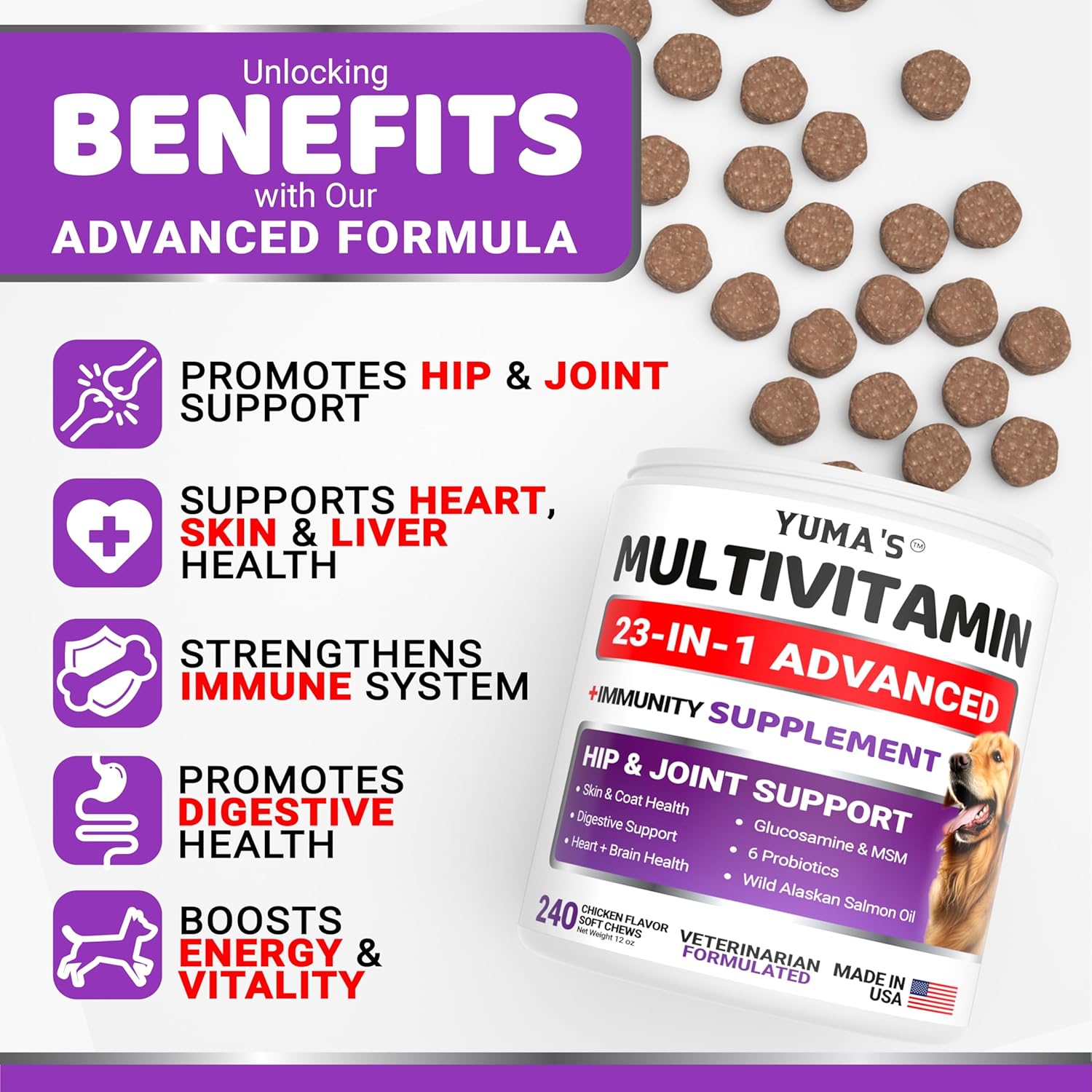 Dog Multivitamin Chewable with Glucosamine – 240 Treats – Dog Vitamins and Supplements – Senior & Puppy Multivitamin for Dogs – Hip & Joint Support – Immune Health, Skin, Heart, Digestion, Probiotics