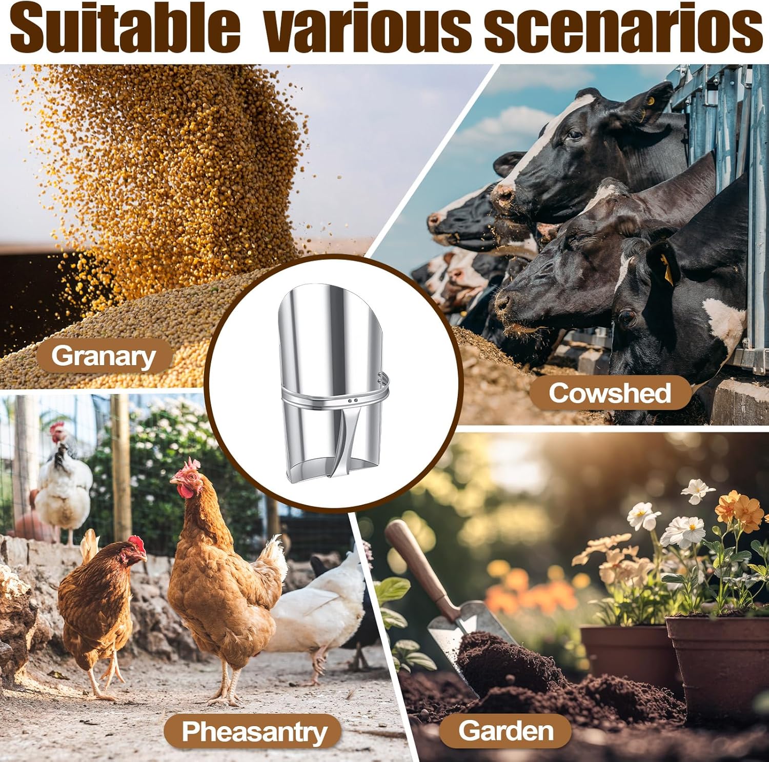 Designed for Convenience: this metal feed scoop sporting a wide mouth and an enclosed design, the feed scoop prevents spillage, ensuring that every bit of feed makes it to its intended destination;feed scoop for livestock with heavy duty, easy grip handle, the feed scoop with handle is a pleasure to work with; The design ensures a comfortable grip, thereby minimizing strain and discomfort during prolonged use; Say goodbye to hand fatigue and hello to improved productivity with the feed scoop
