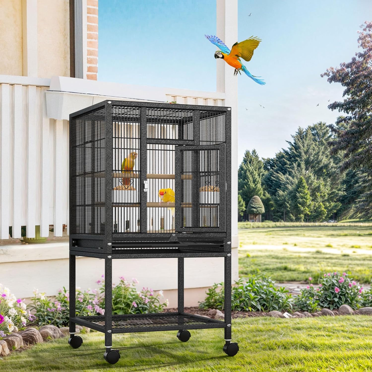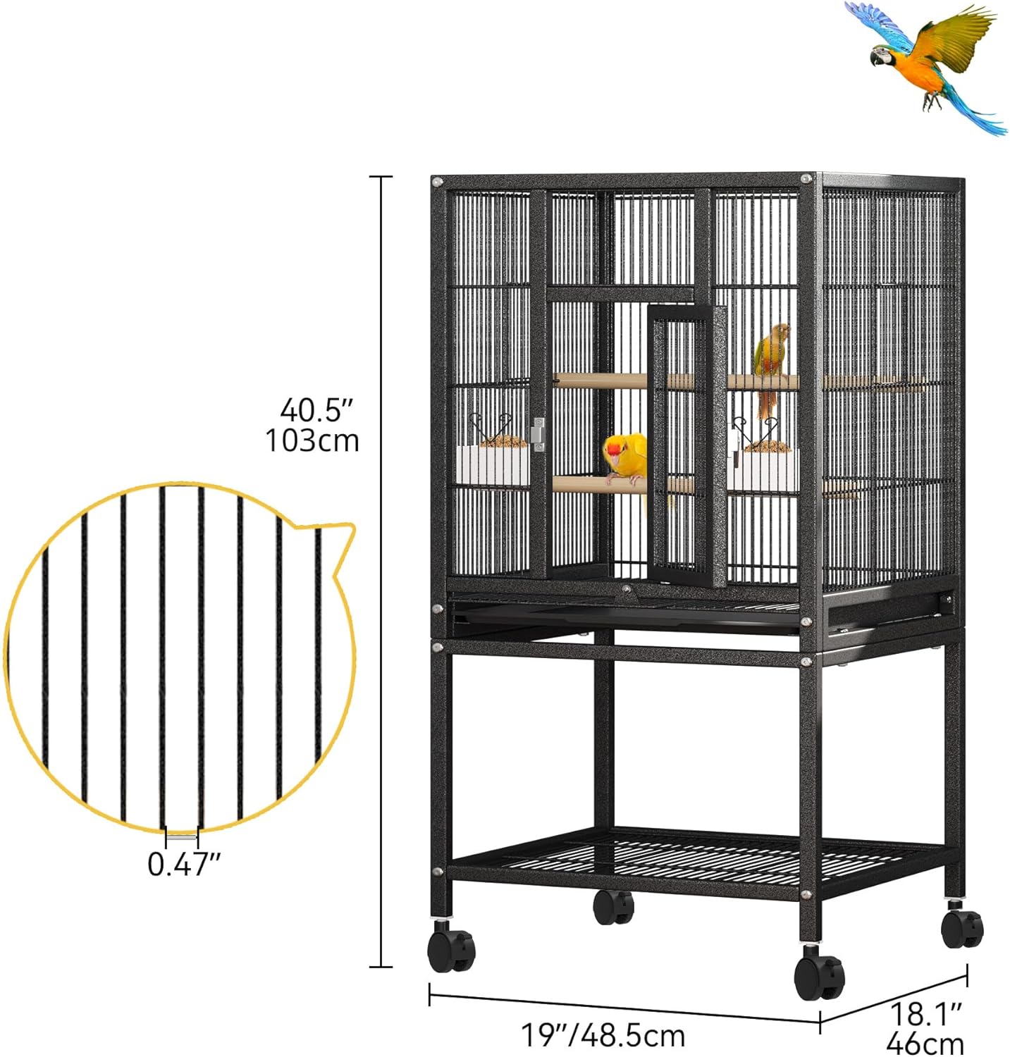 Spacious 41-Inch Black Bird Cage – Measuring 19″W × 18.1″D × 40.5″H, this sleek avian home features a sturdy iron frame suitable for cone-tailed parrots, lovebirds, cockatiels, and finches. Its generous interior allows birds to flutter freely while adding modern elegance to your space
