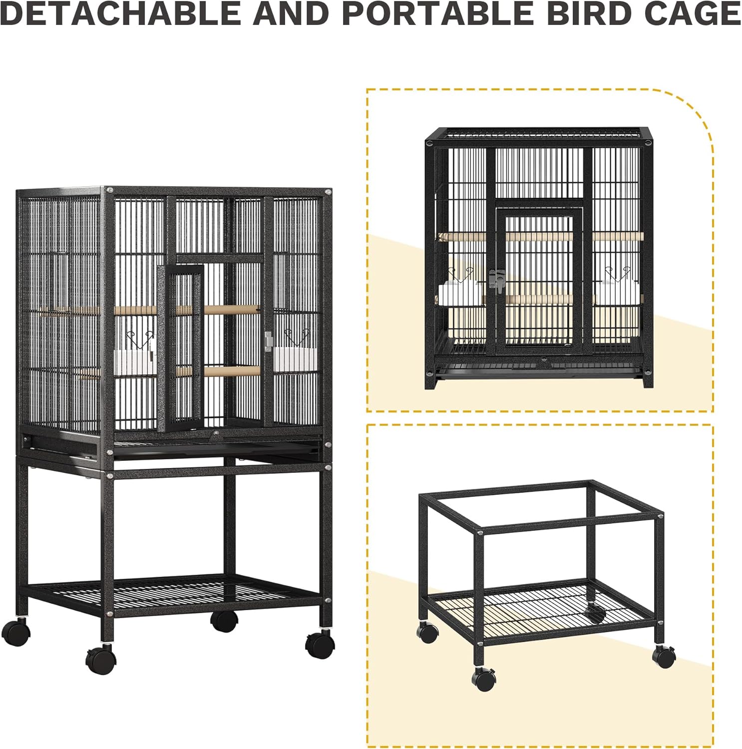 DWVO 41-inch Metal Bird Cage: Large Parrot Cages with Rolling Stand – Features Tray, Food Boxes & Wooden Perches for Parakeets, Lovebirds, Cockatiels, Finches and Pigeons, Black