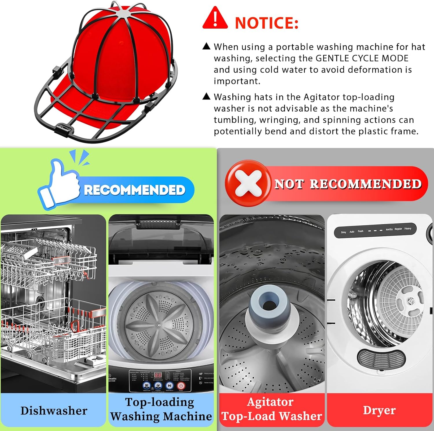 1) If you use the hat washer in portable washing machine, please choose Gentle Cycle Mode and use cold water to washing;