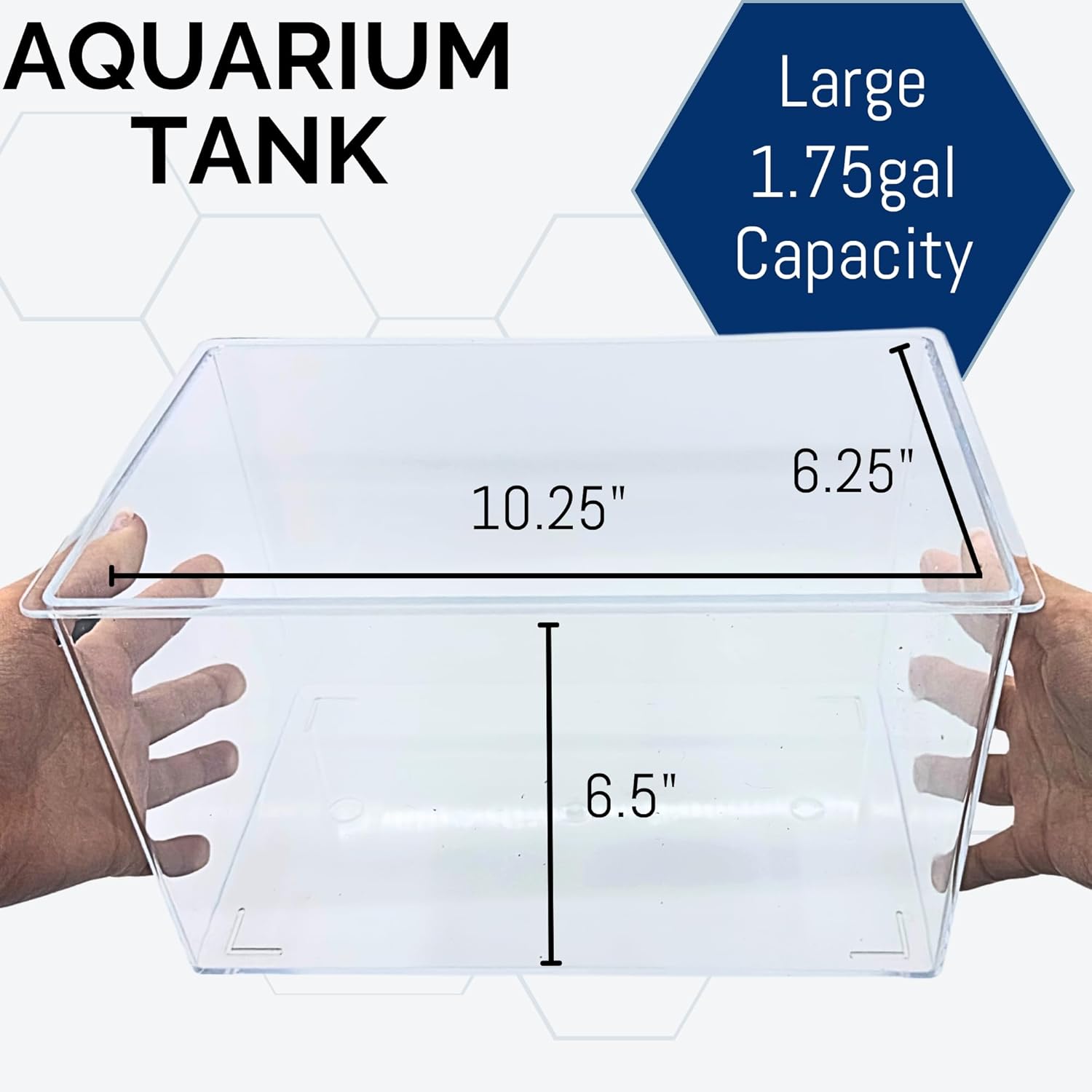 INCLUDES || One large aquarium tank made from molded polycarbonate plastic, with a 1.75-gallon capacity and dimensions of 10.25″ x 6.5″ x 6.25″.