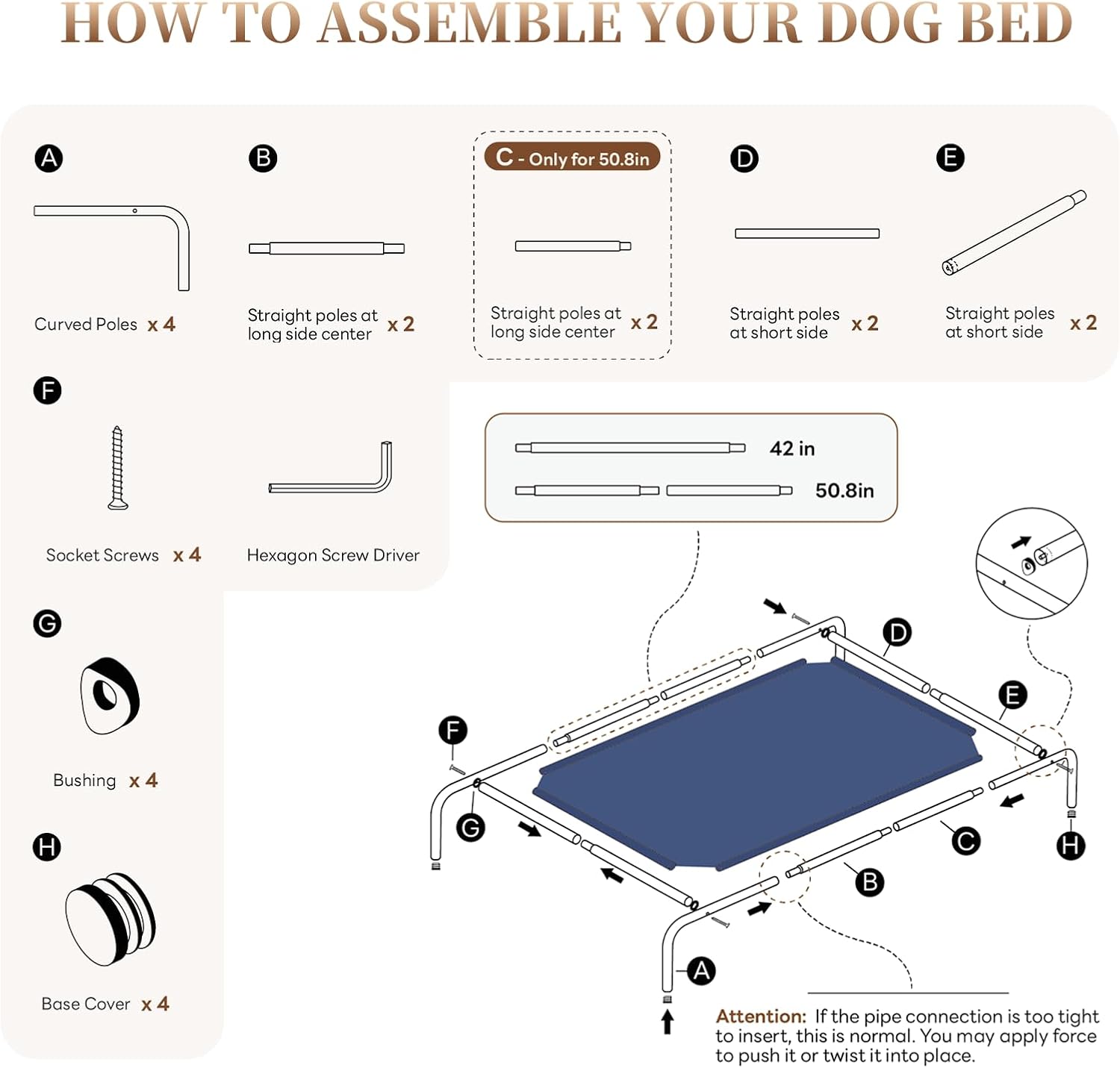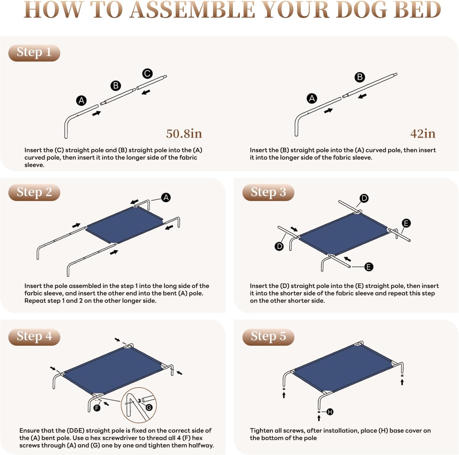 【Product Dimensions】This raised dog bed measures 50.8″ L x 31.5″ W x 8″ H (elevated sleeping area: 43.3″ x 31″) .Supports dogs up to 95 lbs
