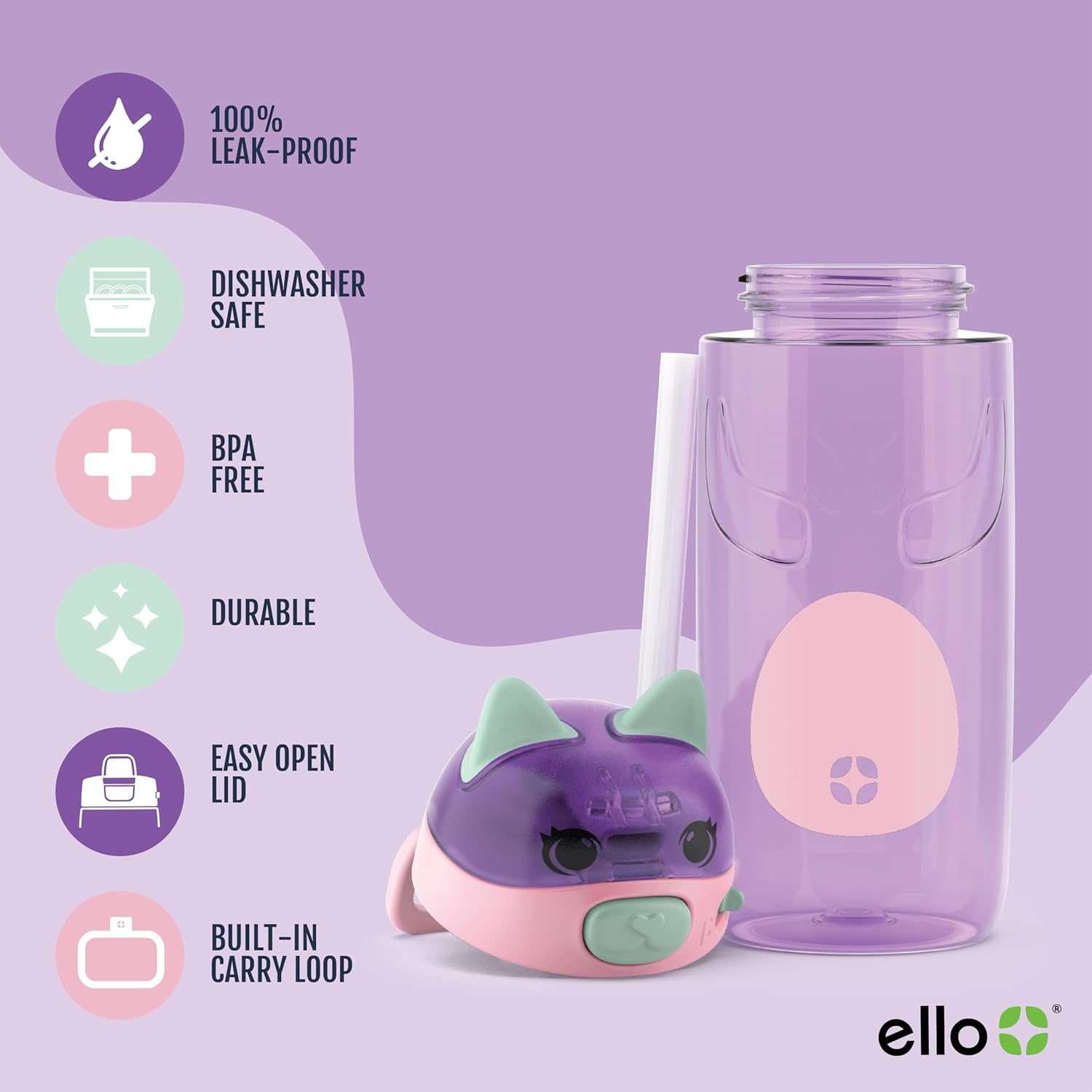 Ello Ellies 16oz Plastic Kids Water Bottle with Straw and Built-in Carrying Handle and Leak-Proof Locking Lid for School backpack, Lunchbox and Outdoor Sports, Cat
