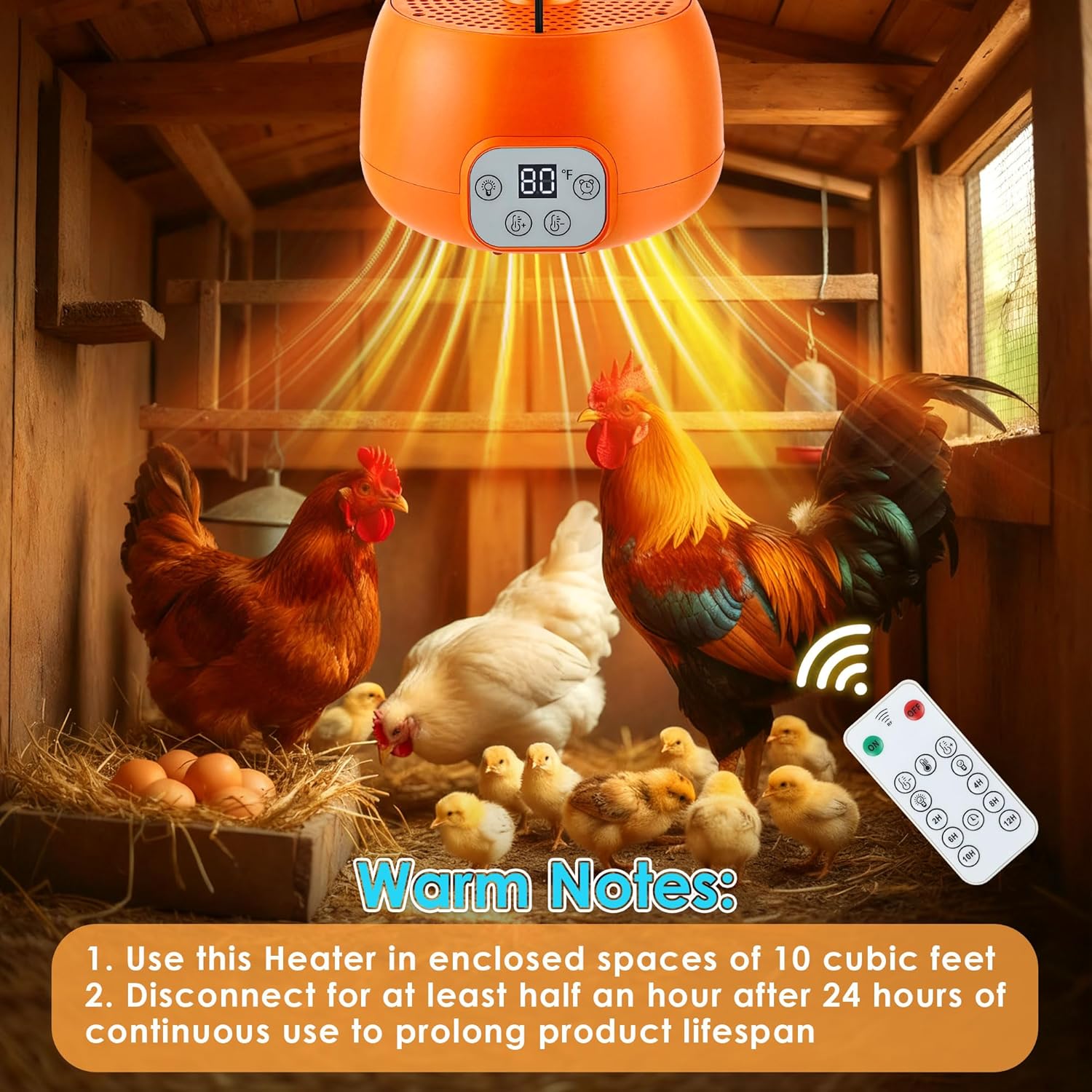 Precautions: It’s recommended to use the chicken coop heaters inside coop in an enclosed space within 10 cubic feet. Larger spaces may cause the heating coil to run continuously. Please disconnect it for at least half an hour after running continuously for 24 hours to extend its usage life