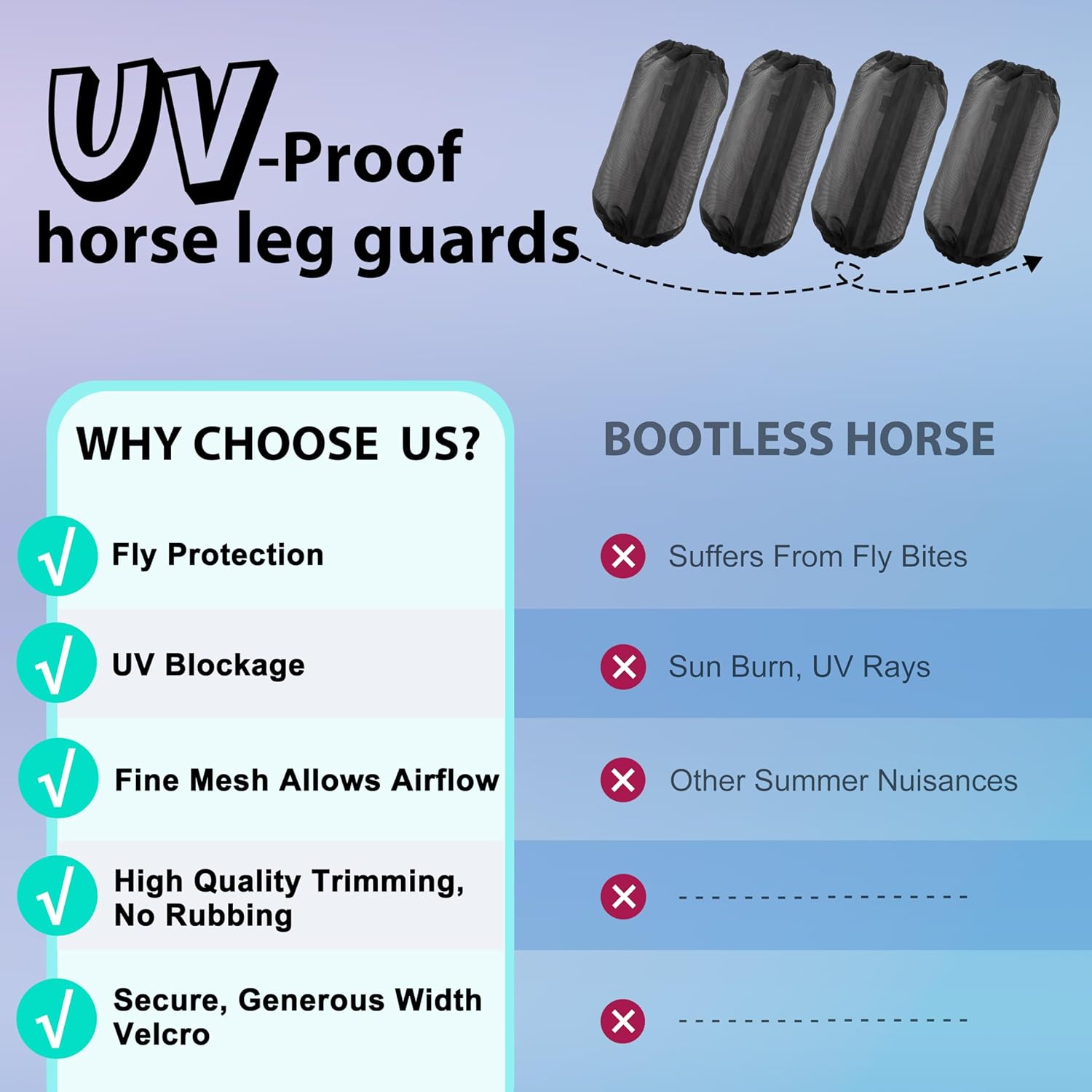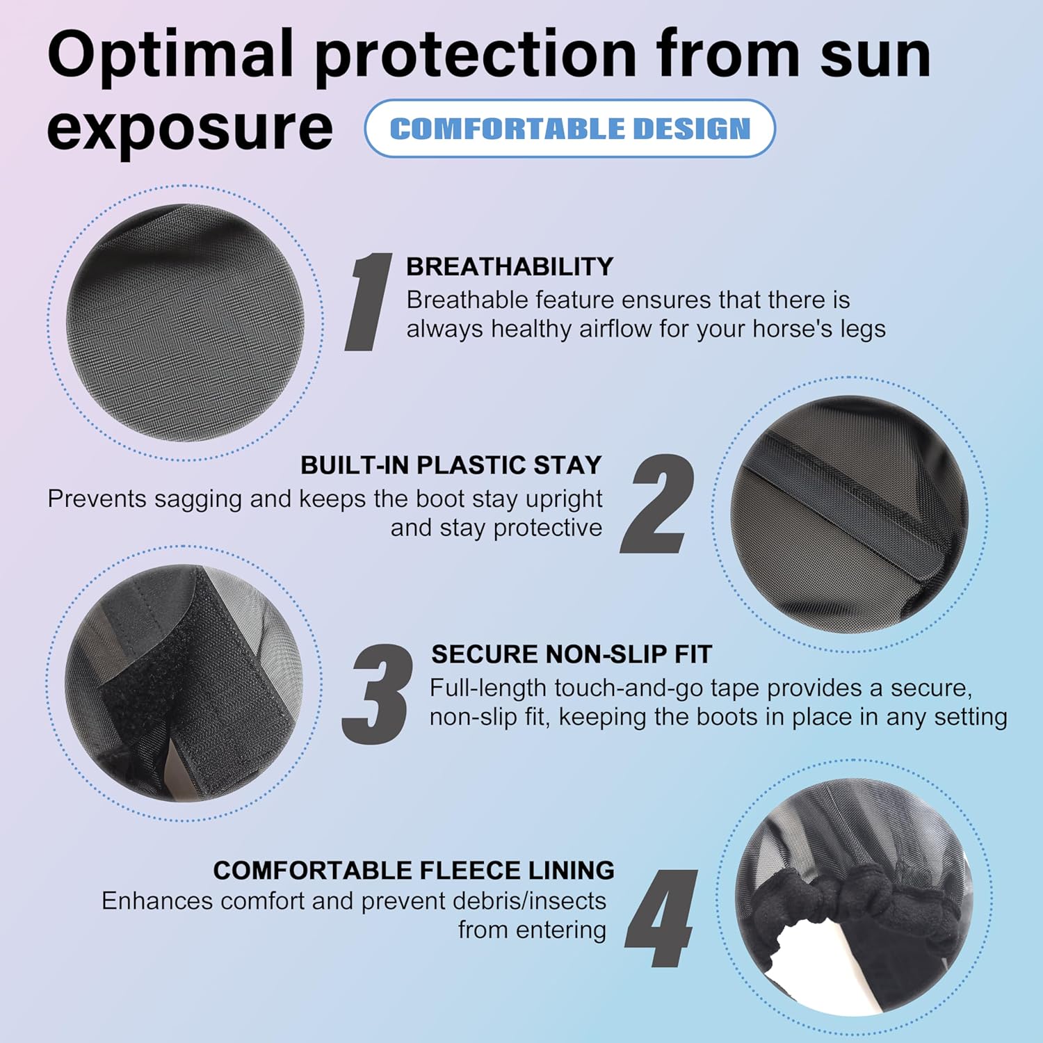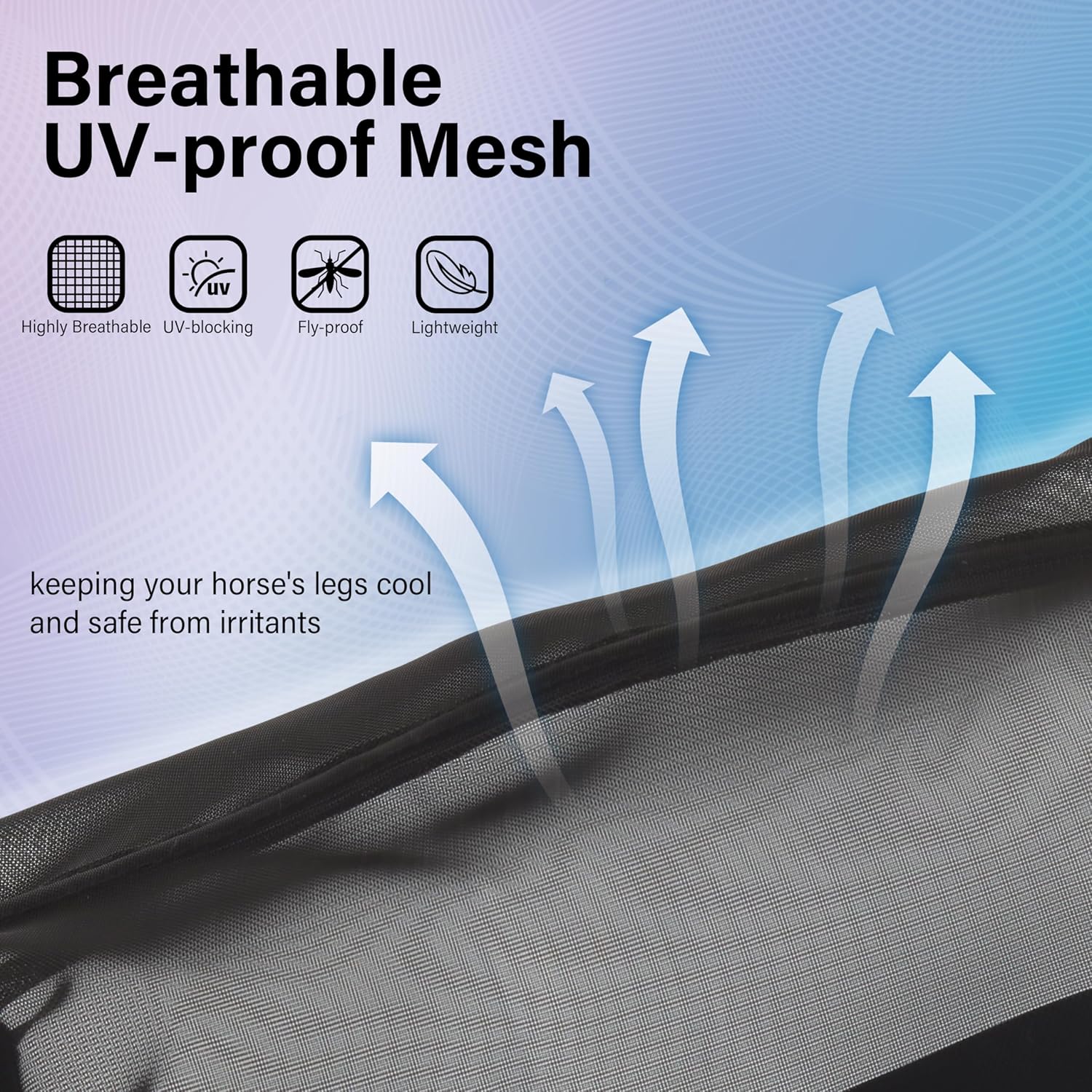 Breathable UV-proof Mesh: UV-proof fine nylon mesh protects from sun exposure and ensures excellent airflow, keeping your horse’s legs cool and safe from irritants.