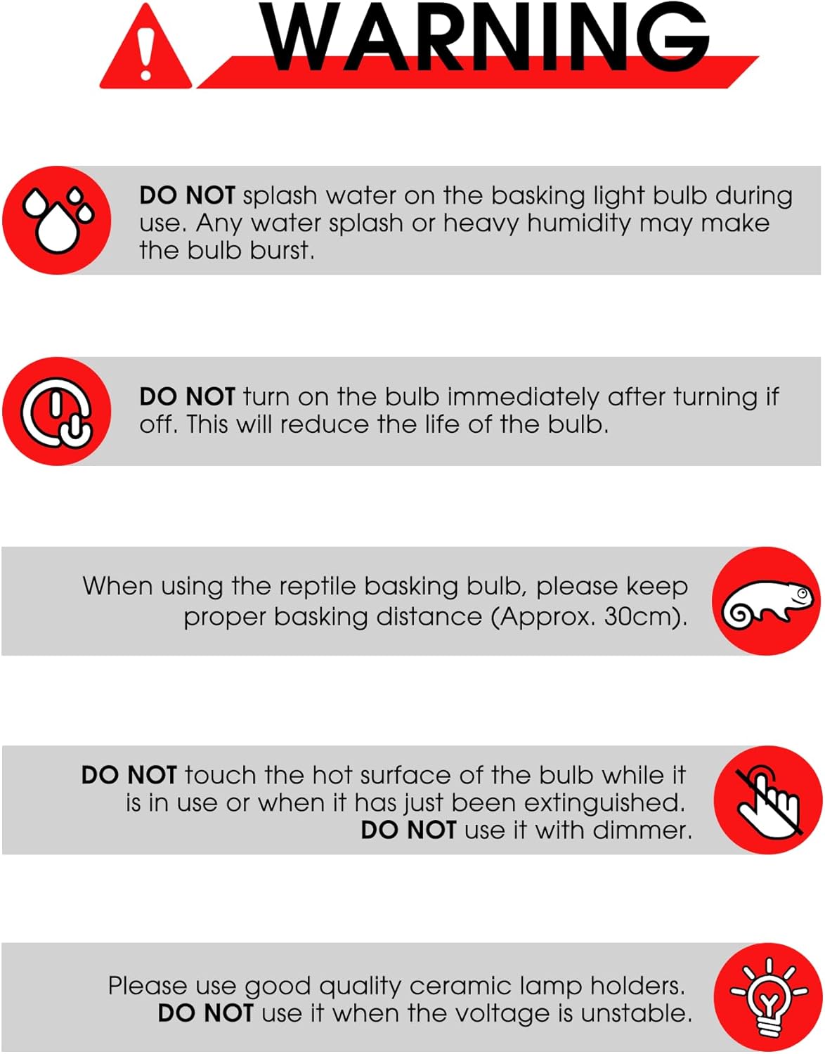 【Reptile Heat Lamp】At Work, The Heat Light Bulb Surface Temperature Is Higher, Please Do Not Touch. When using the reptile basking bulb, keep a distance of more than 33cm from reptiles. Do not splash water on the basking light for reptiles during use.