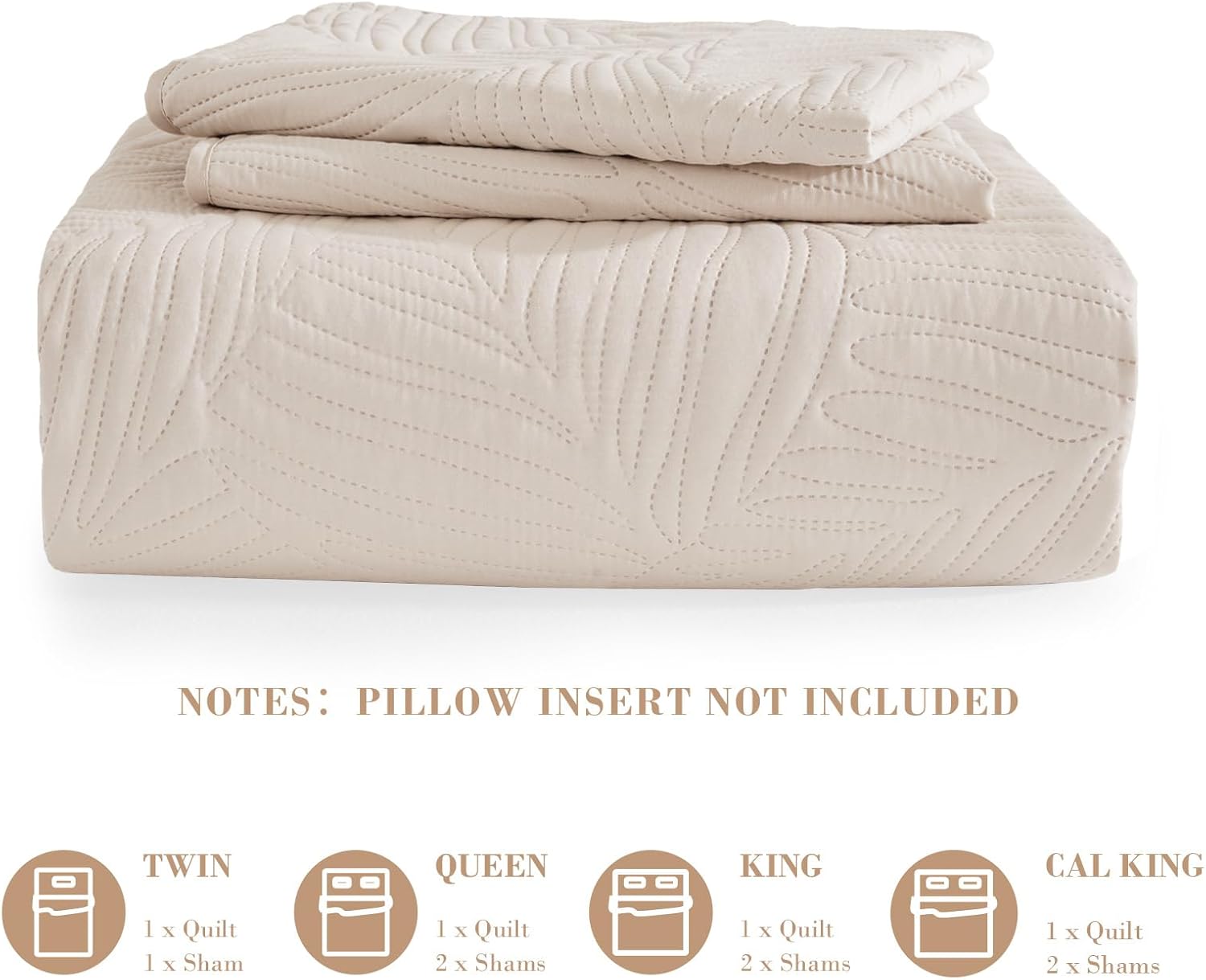 Package Includes: The king quilt set comes with a quilt king size 104 inch x 96 inch and two matching pillow shams 20 inch x 36 inch. If you want the bedspreads or coverlets to cover all sides and end of your bed like the picture, you may purchase a larger size or need a low bed. Note: The pillow insert is not included