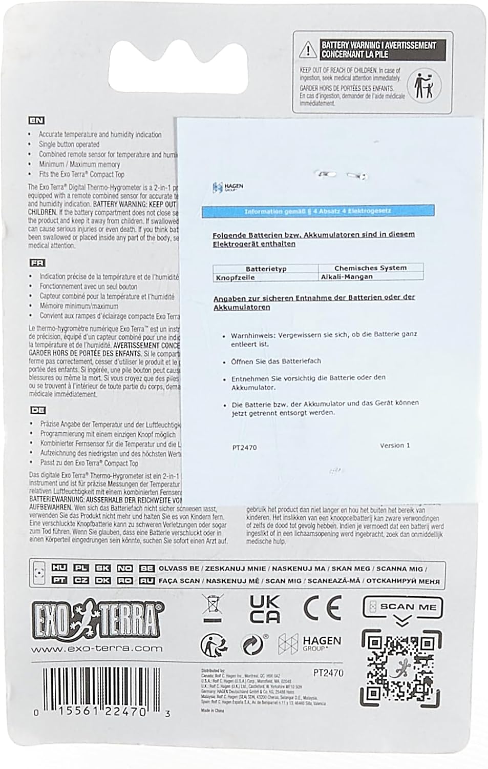 The Exon Terra Digital Thermo-Hygrometer is a combination thermometer and hygrometer. This 2-in-1 precision instrument is equipped with a remote combined sensor for accurate temperature and humidity indication, and has a programmable minimum/maximum memory setting which can be controlled with a single button.ndurable and easy to use, the Exon Terra Digital Thermo- Hygrometer can be installed with hook & loop fastener (included), or by simply sliding it into position on top of the Exon Terra Compact Top or Dual Top Canopy.