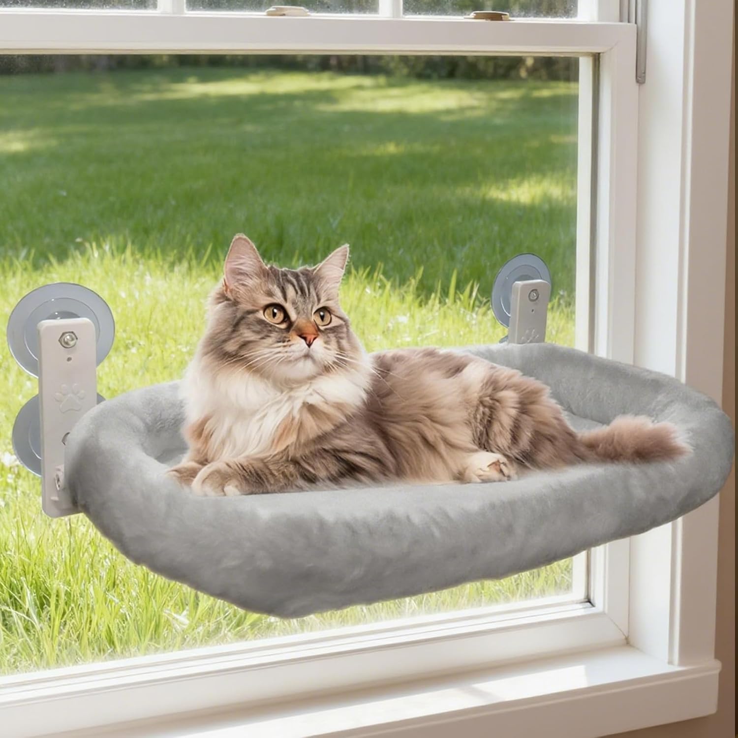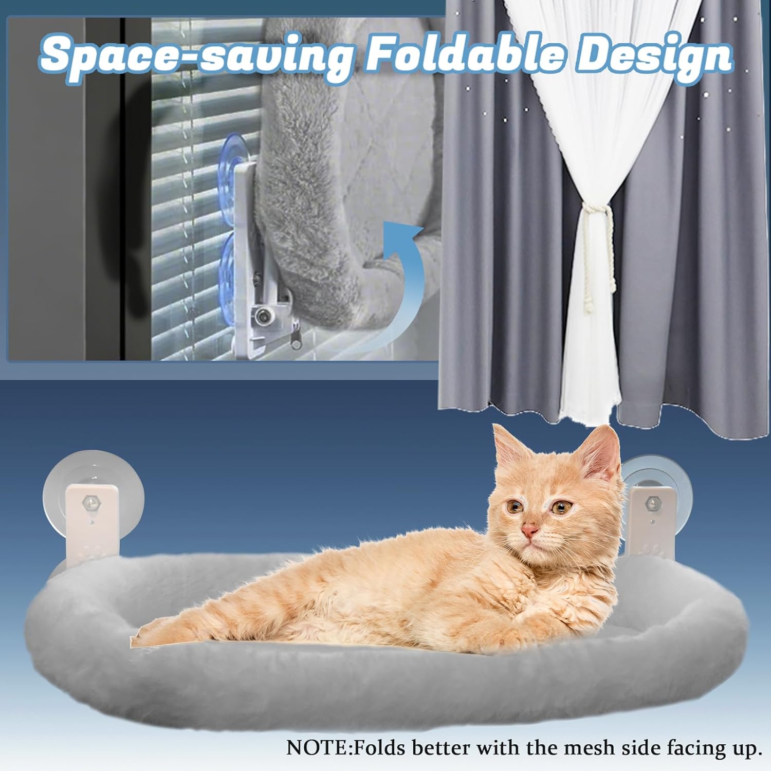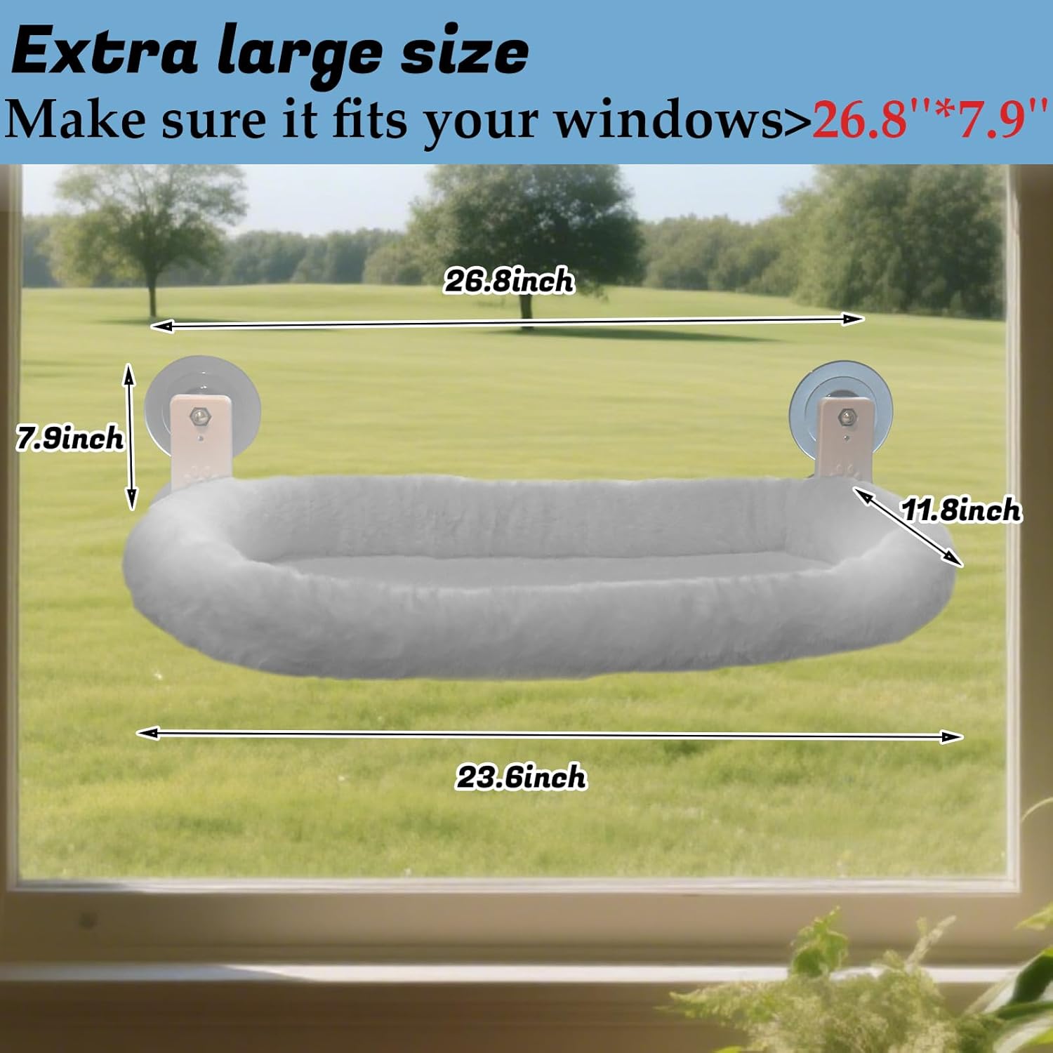 Extra Large Cat Window Perch (23.8×11.8in) – Washable 2-Season Fabric Cover, 4 Strong Suction Cups, Solid Metal Frame – Foldable Cat Hammock for Large Cats/2 Cats, Cordless Design (Grey)