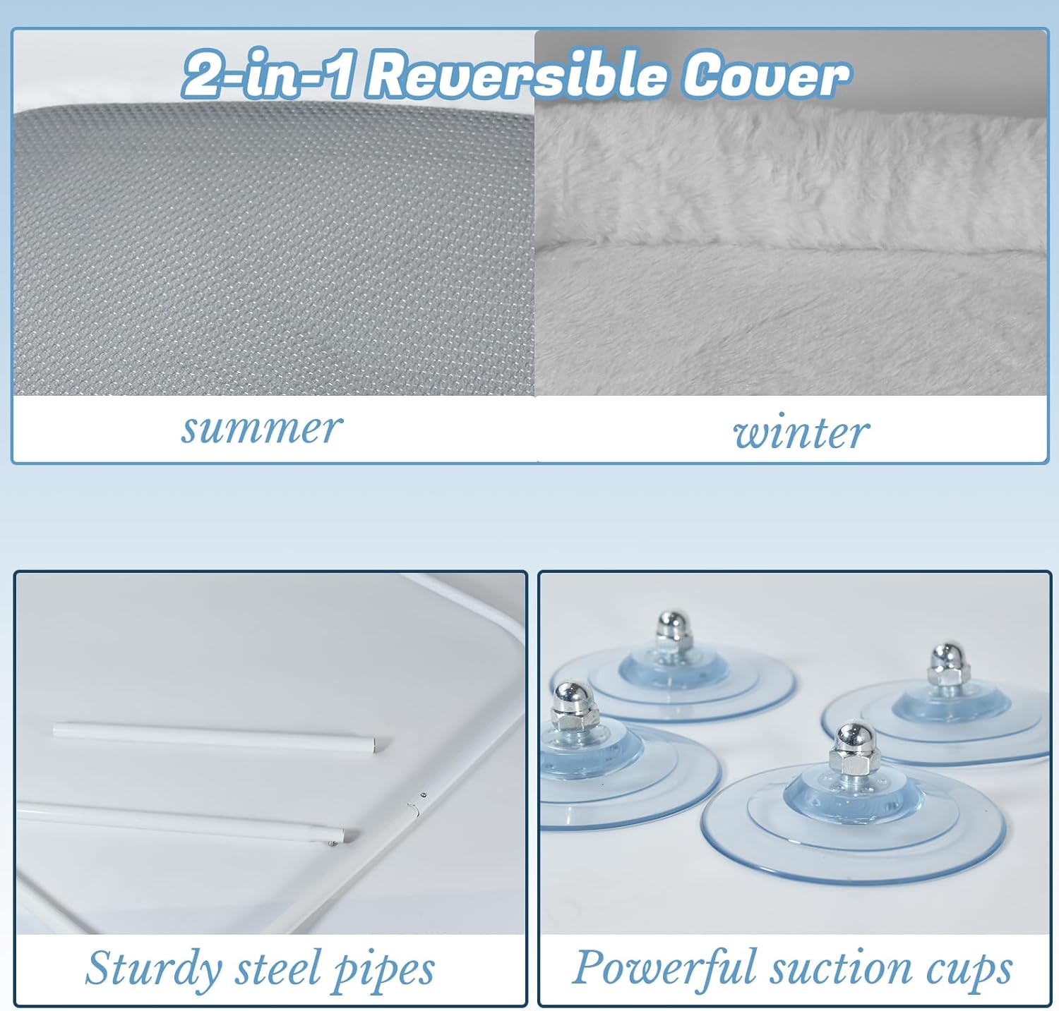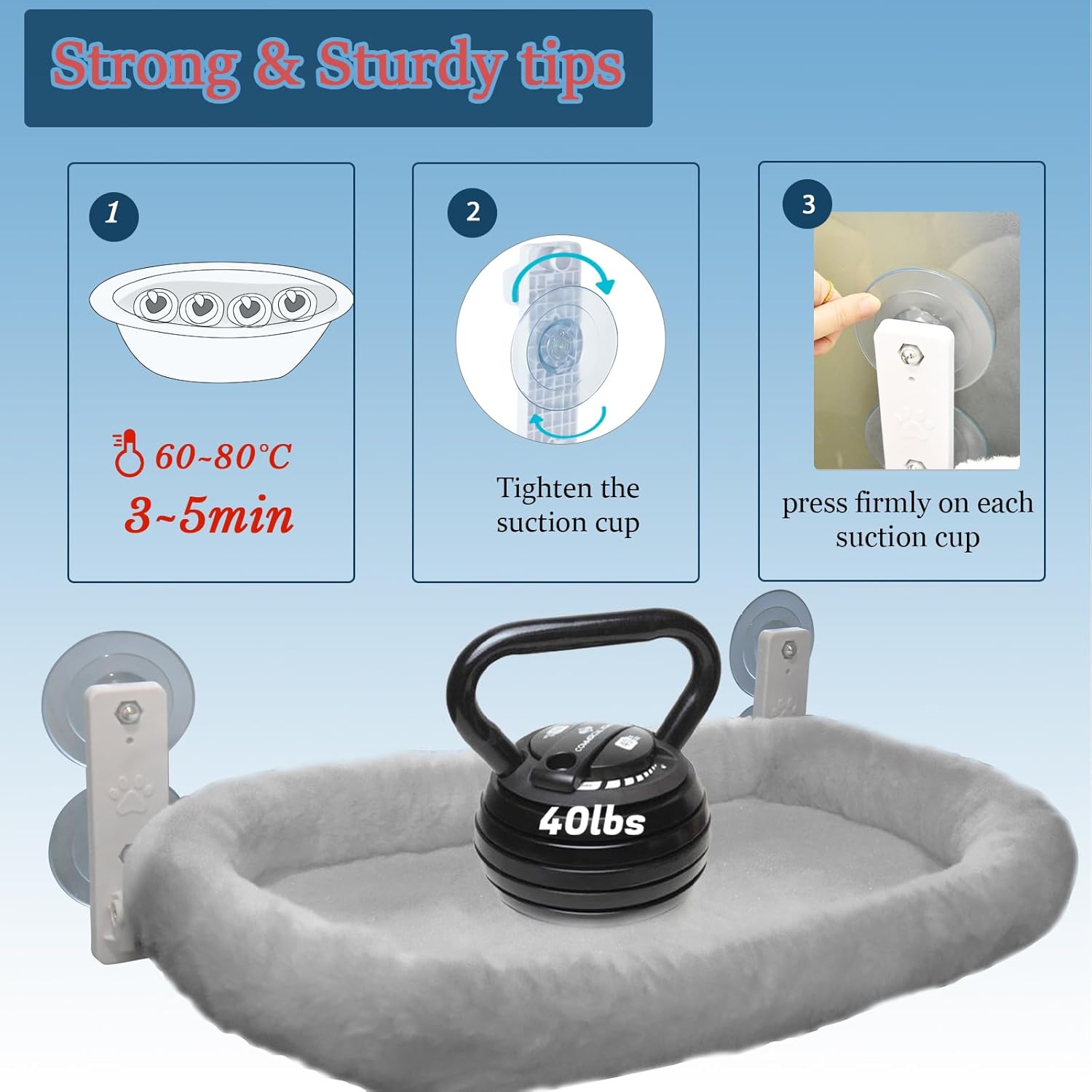 【4 strong suction cups + solid metal frame】 – stable and durable! The suction cups lock tightly on smooth windows, holding up to 40lbs (suitable for most cats). The heavy-duty metal frame won’t bend or break, even if your cat jumps on/off quickly. No risk of falling—give you peace of mind.