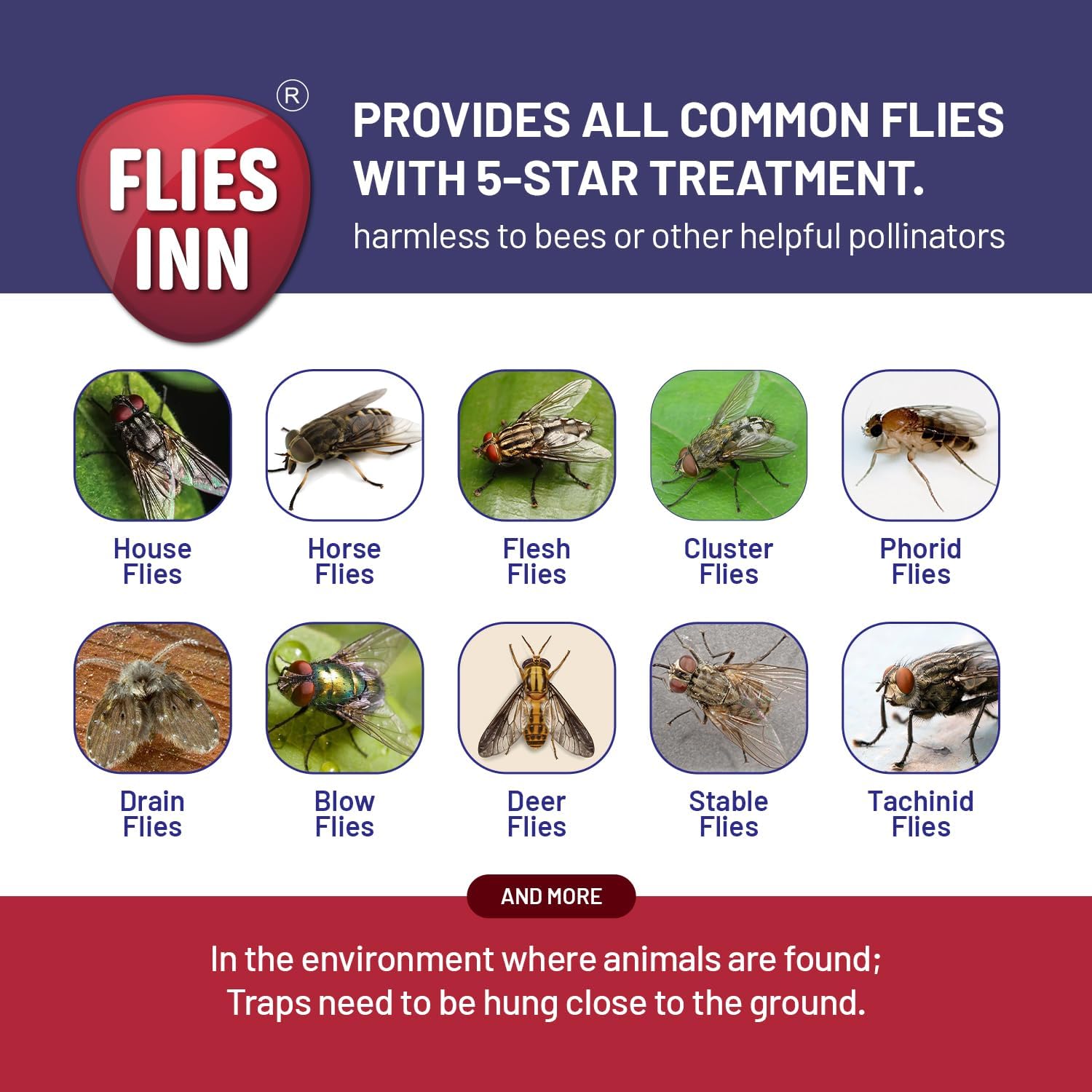 Its formulated with animal feed items and commonly consumed food commodities. It attracts all common flies, including hundreds of the most prevalent species. Harmless to bees or other pollinators.