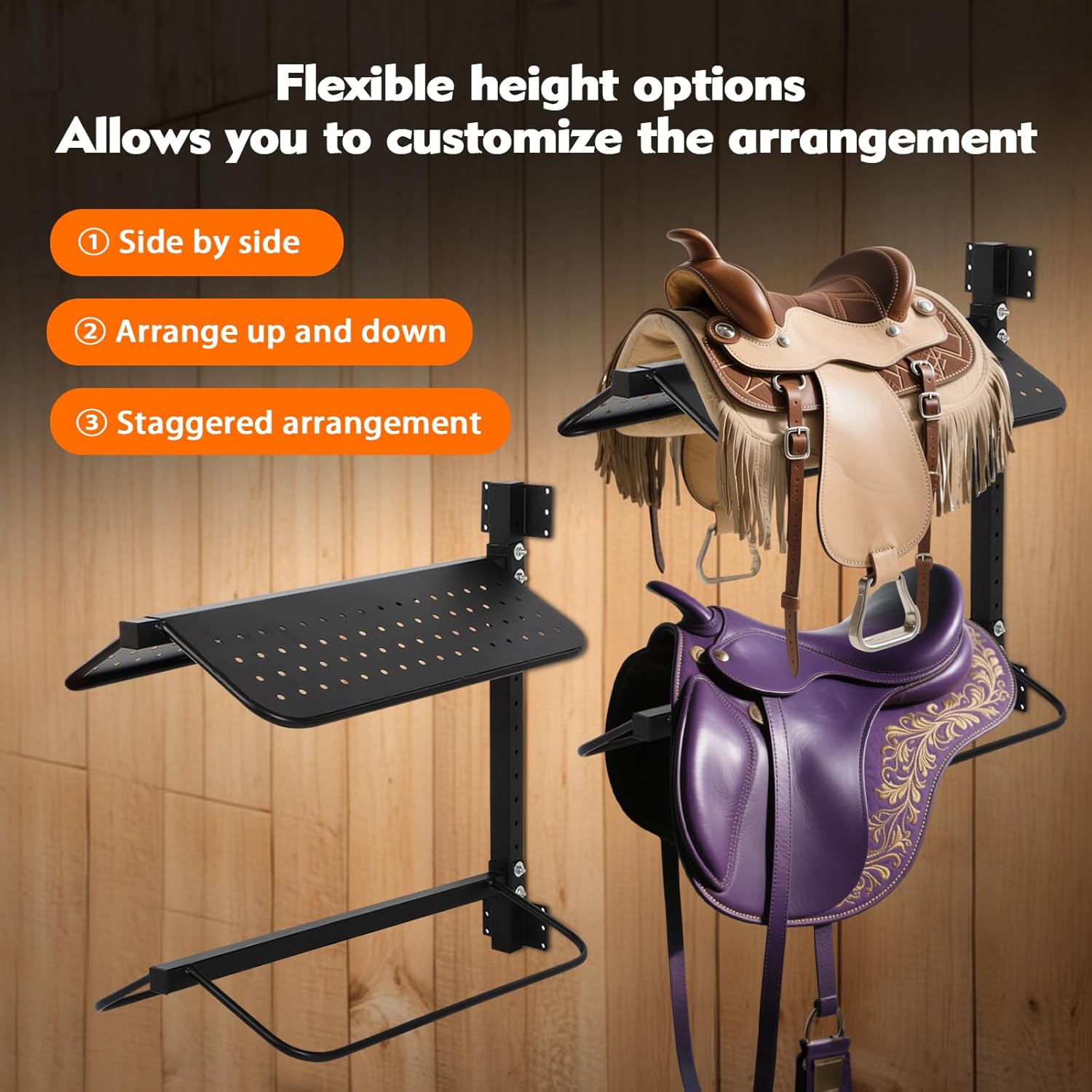 Flexible adjustment: The two-pack saddle rack stand has a total of four layers with adjustable height and flexible arrangement. It is not restricted to a fixed pattern, making it convenient to take and place saddles, adapt to a variety of spaces, and improve space utilization.