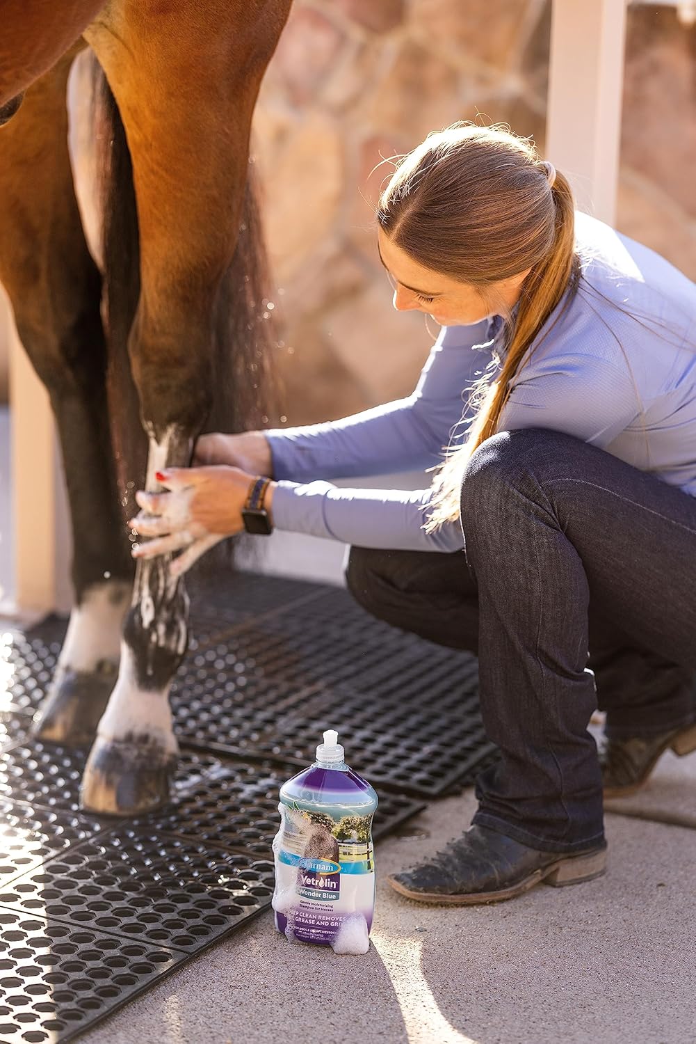 Farnam Vetrolin Wonder Blue is a gentle, moisturizing shampoo for horses. It deep cleans to remove dirt, grease and grime. It is a premium equine moisturizing shampoo and contains Aloe Vera.