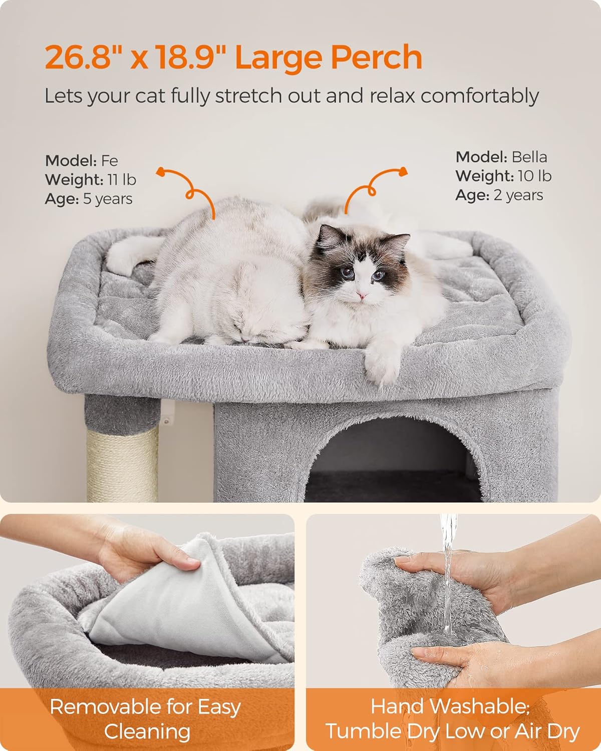 [Large Perch] This cat tree features a large 26.8″ x 18.9″ perch with well-padded raised edges, offering roomy space for your cat to stretch out and relax comfortably. Ideal for 1 extra large cat, such as Maine Coon, or 2-3 large cats snuggling together
