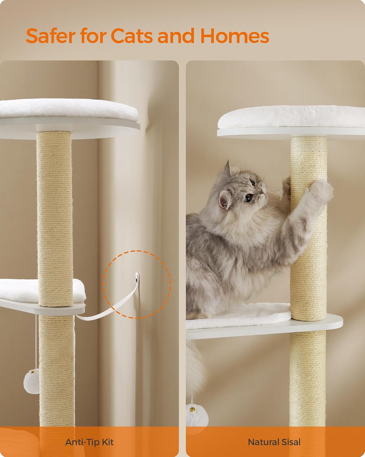 [Strong, Stable, Safe] Crafted with particleboard and tough-wearing sisal, equipped with a thickened base with non-slip pads underneath, and ensured by an anti-tip kit, this cat furniture piece is strong, stable, and safer for cats to climb up and down