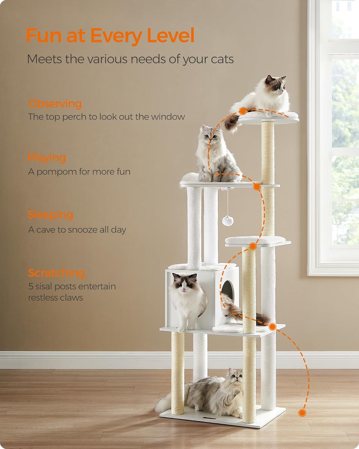 [65” Tall, Multi-Level Fun] Watching birds on the top perch, sleeping in the cave, or playing on the base board—this 65” tall cat tree offers varied fun on different levels for your cats and is ideal for multi-cat households