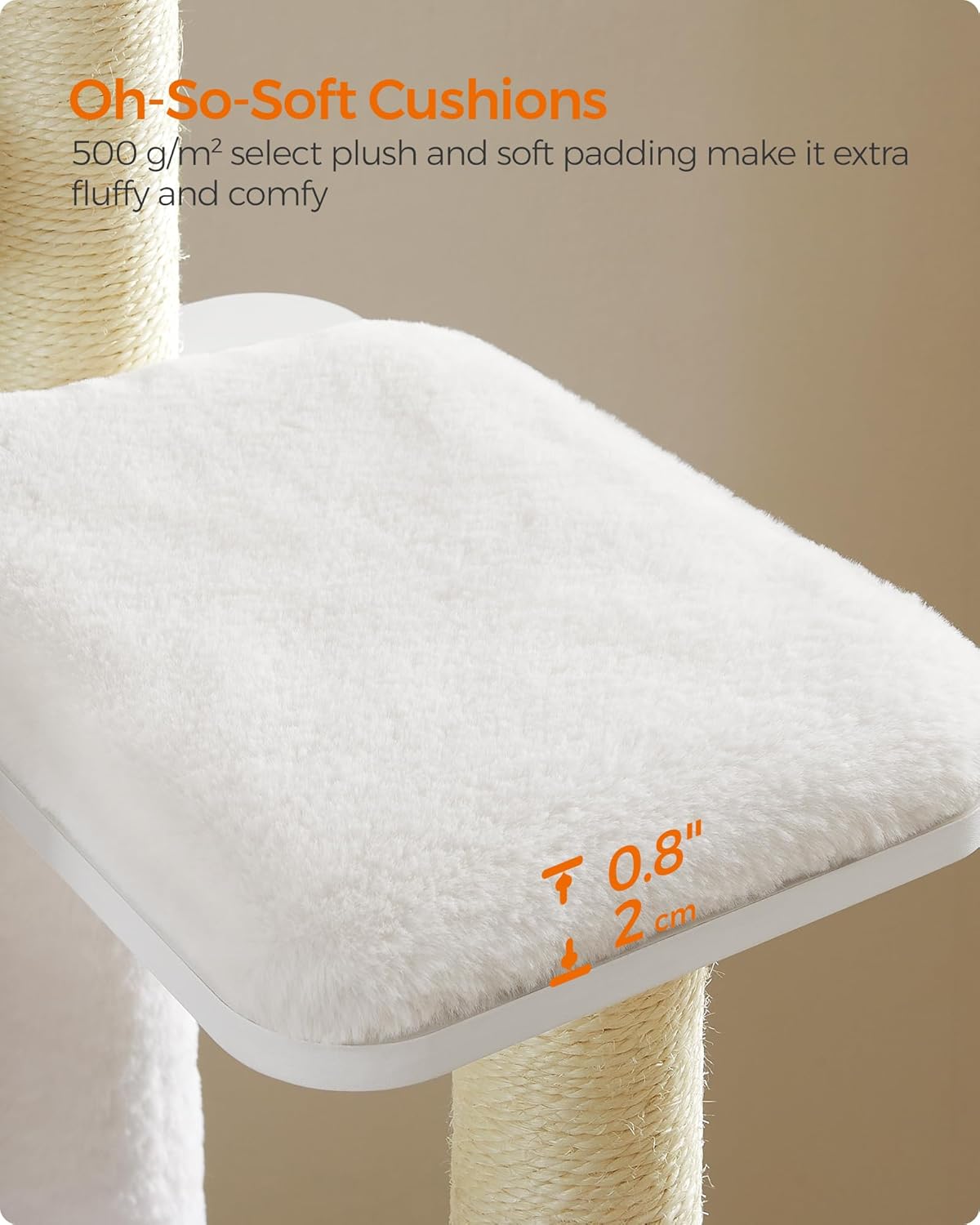 [Next-Level Comfort] The cat climber comes with three 0.8″ thick cushions that are well padded and covered with 500 g/m² plush—even denser, softer, and fluffier than common plush—letting your little furballs snooze and cuddle in softness