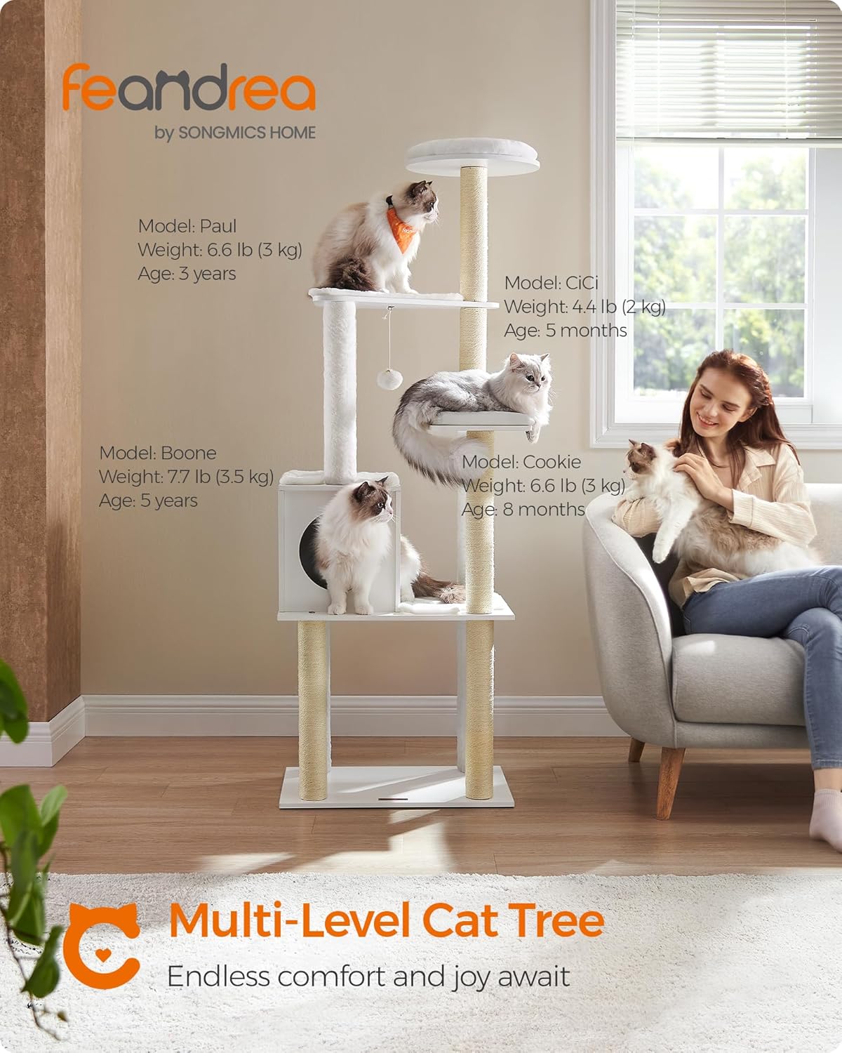 13 reviews for Feandrea Cat Tree, 65-Inch Modern Cat Tower for Indoor Cats, Multi-Level Cat Condo with 5 Scratching Posts, Perch, Washable Removable Cushions, Cat Furniture, Cloud White UPCT166W01