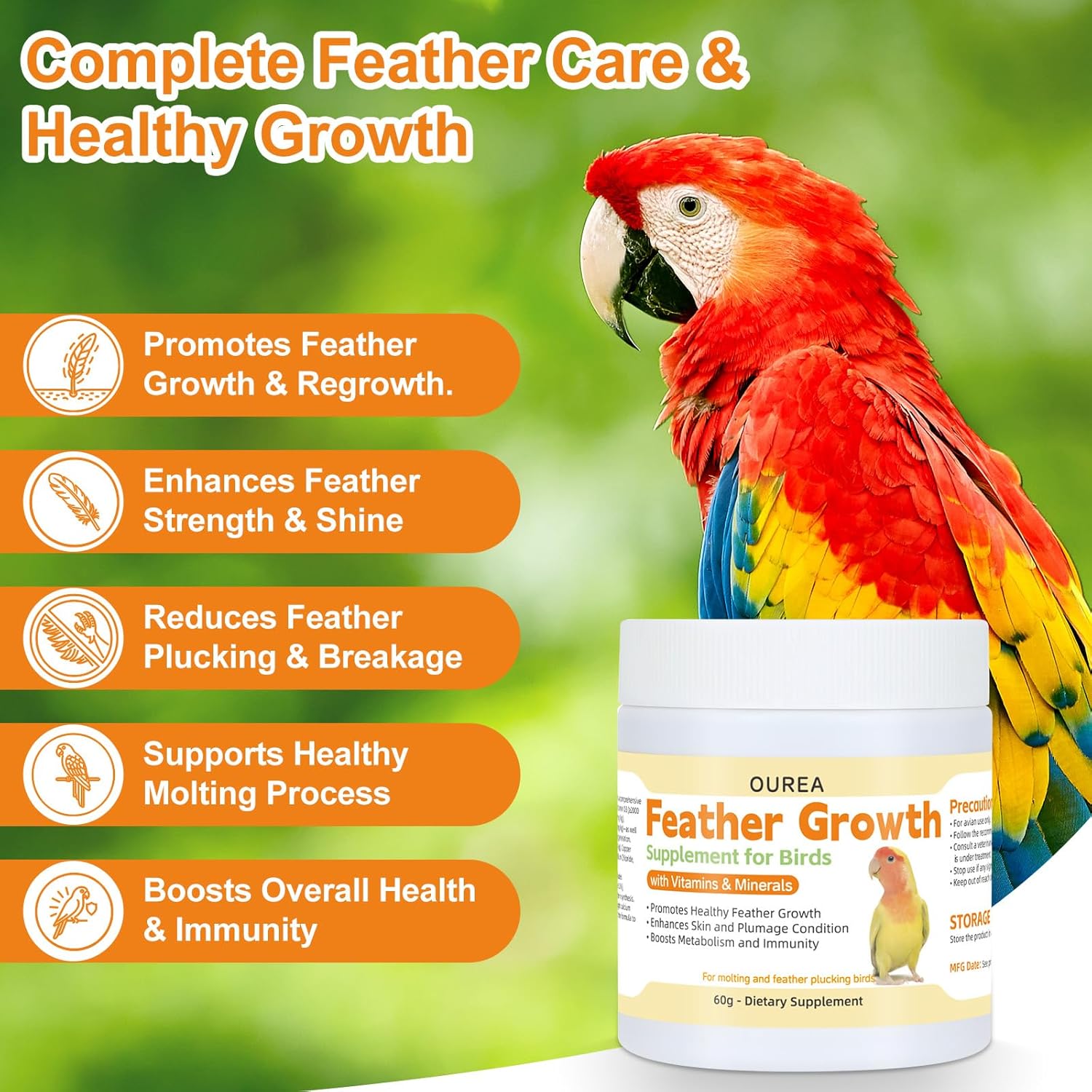 Promotes Rapid Feather Regeneration: Enriched with 11 essential vitamins, this product is specifically formulated for feather growth in birds and parrots. It helps repair damaged feathers and accelerates the growth and regeneration of new feathers. It’s particularly suitable for birds during molting or with damaged or plucked feathers, supporting dense, healthy feather growth.