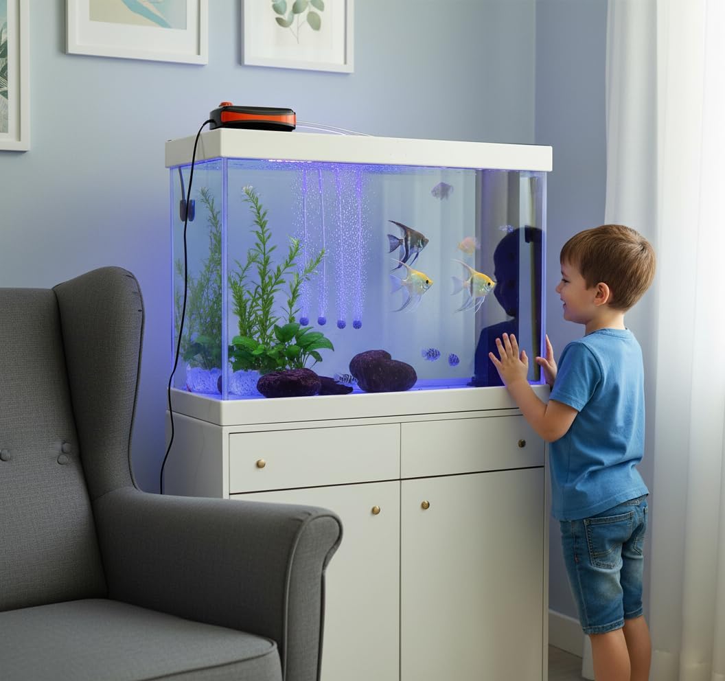 I adore the option to hook up multiple air bubblers and sponge filters to one air pump. A pump like this is essential if you are running multiple tanks that all need lower flow options for your aquatic pets. The one caveat is that the 4th nozzle has much less output than the first, so you don’t get even distribution when using all 4 nozzles (which I am). It also comes with everything you need to hook up air stones (but I hooked up my own filters and bubblers). Tubing is great, very informative for those who don’t know how to stop backflow.