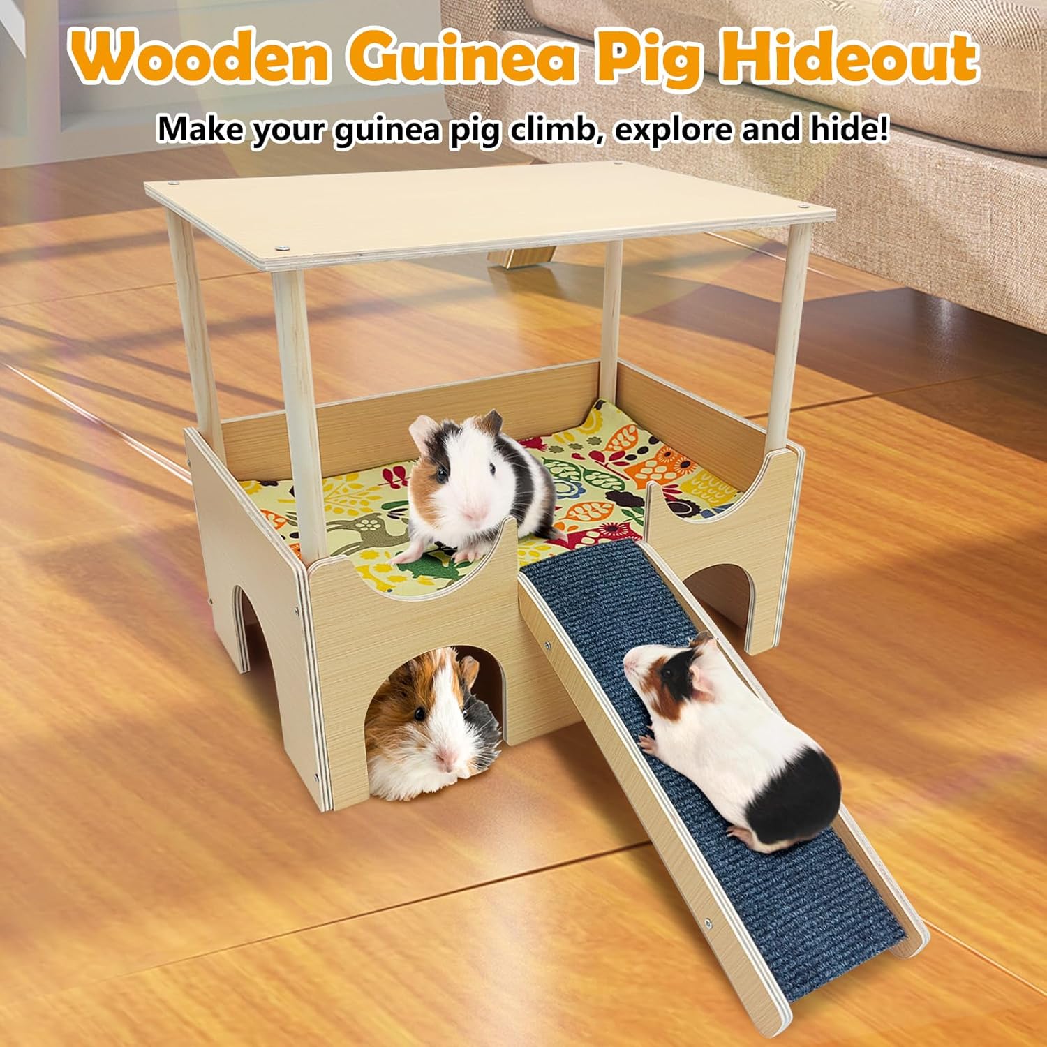 Climb & Hide: Our guinea pig hideout is thoughtfully designed with felt stairs for your guinea pigs to chase each other and climb, encouraging exploration and promoting physical and mental health. The wooden bridge not only provides a hideout but can also be used as an abridge for climbing