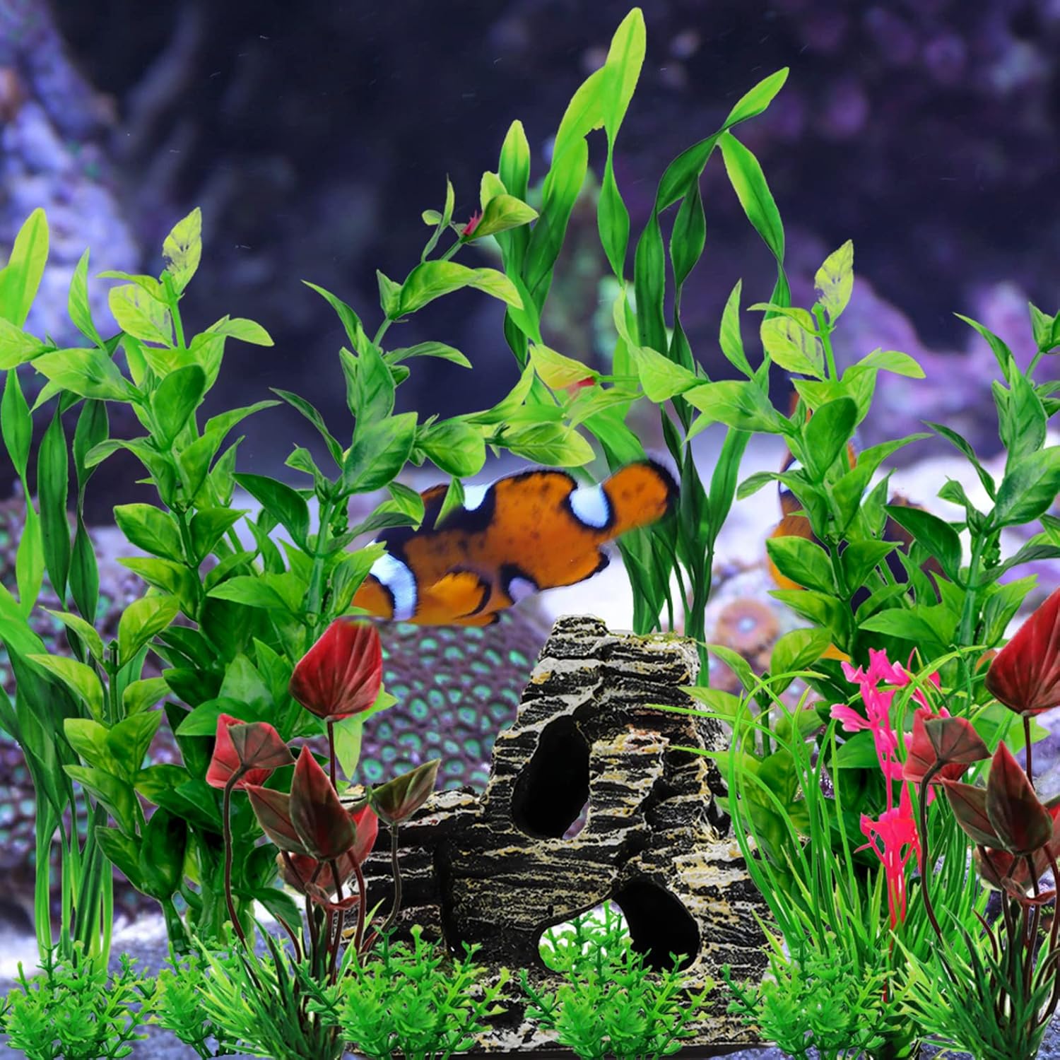 Green Aquarium Decorations: 1 pieces Resin rockery Fish Tank Accessories and 19 Pieces assorted Heights aquarium plants: (2 – 4.9 inch and 2 large plants: 8.5inch, green and red ).