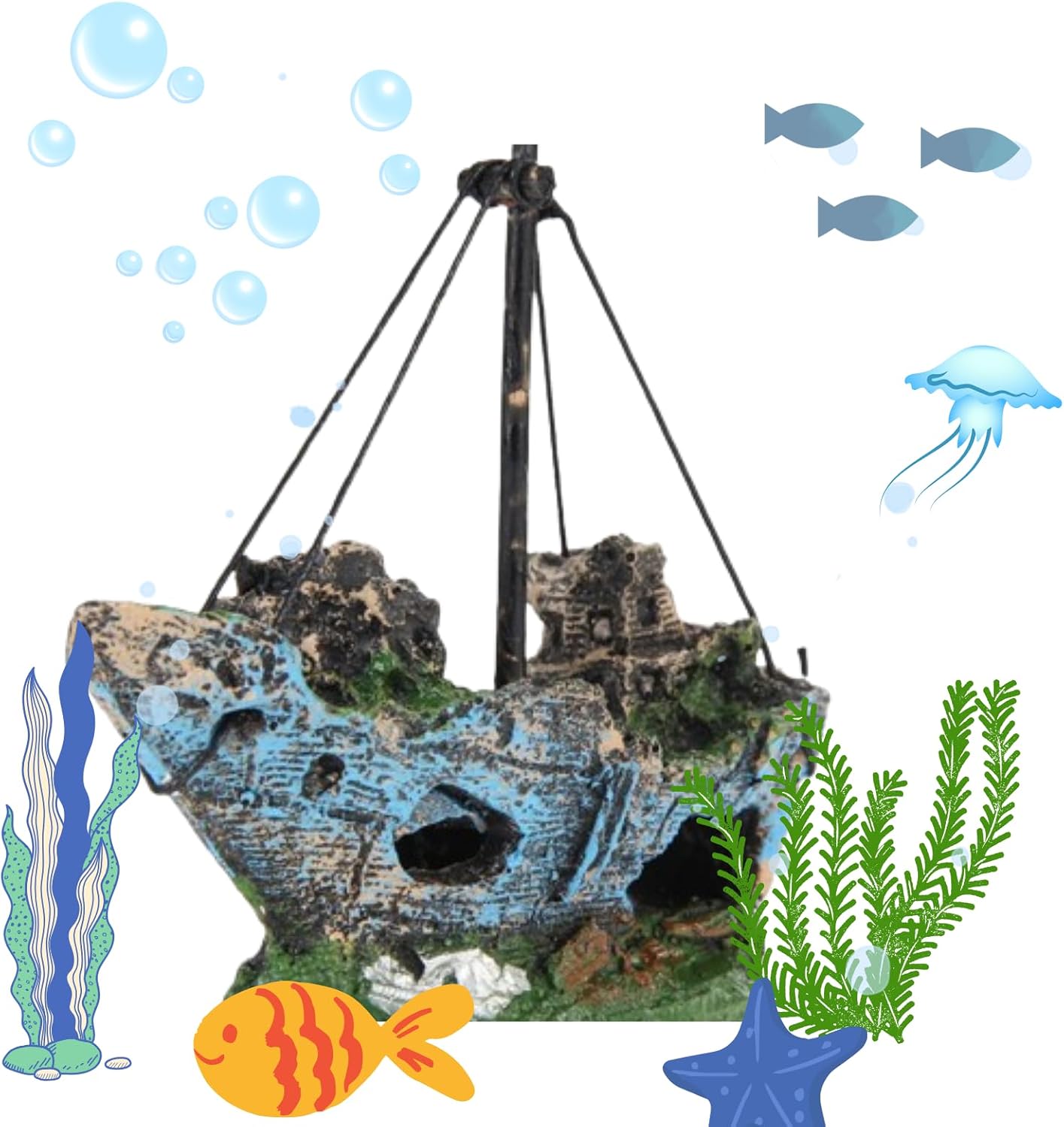 Eco-fridenly: Resin Shipwreck Aquarium Decor are made of high-quality resin,which is non-toxic and non-polluting.Vivid: The Sunken Ship is designed to provide a safe hiding place for your fish, creating a life-like environment that mimics nature and provides a comfortable and relaxing atmosphere.Easy to use: Our fish tank wreck ship decorationsis suitable for both freshwater and saltwater fish tanks. The castle is easy to install and does not require any tools or glue, and can be placed in any position in the fish tank.Good for your fish:and It is a great addition to any fish tank, and can help to create a beautiful and natural environment for your fish to live in.