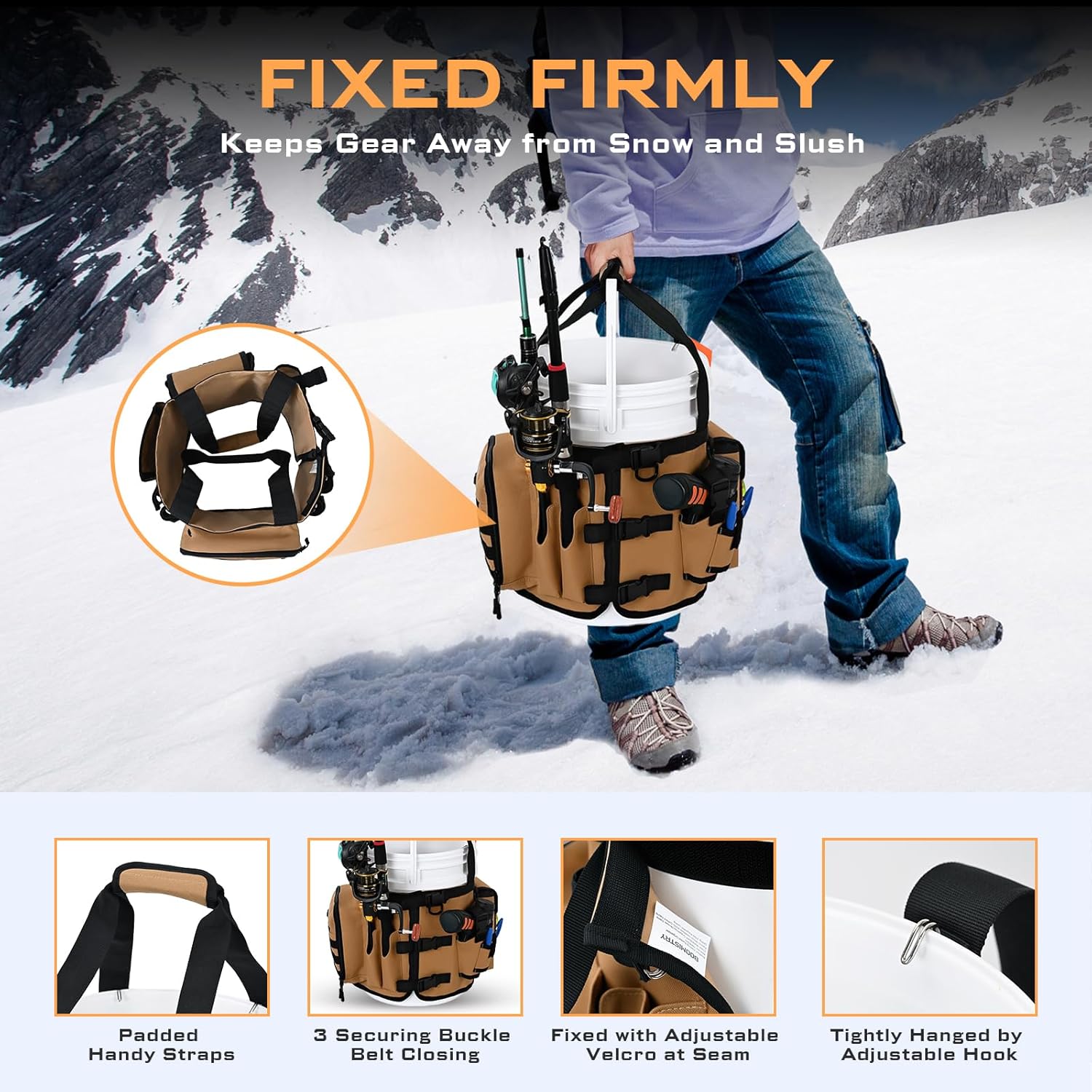 Fishing Bucket Organizer for 5 Gallon Bucket Accessories, Fishing Tackle Bag with Adjustable Buckle, Fishing Rod Bag with 15 Multi-Pockets for Fishing Gear and Equipment (Khaki)