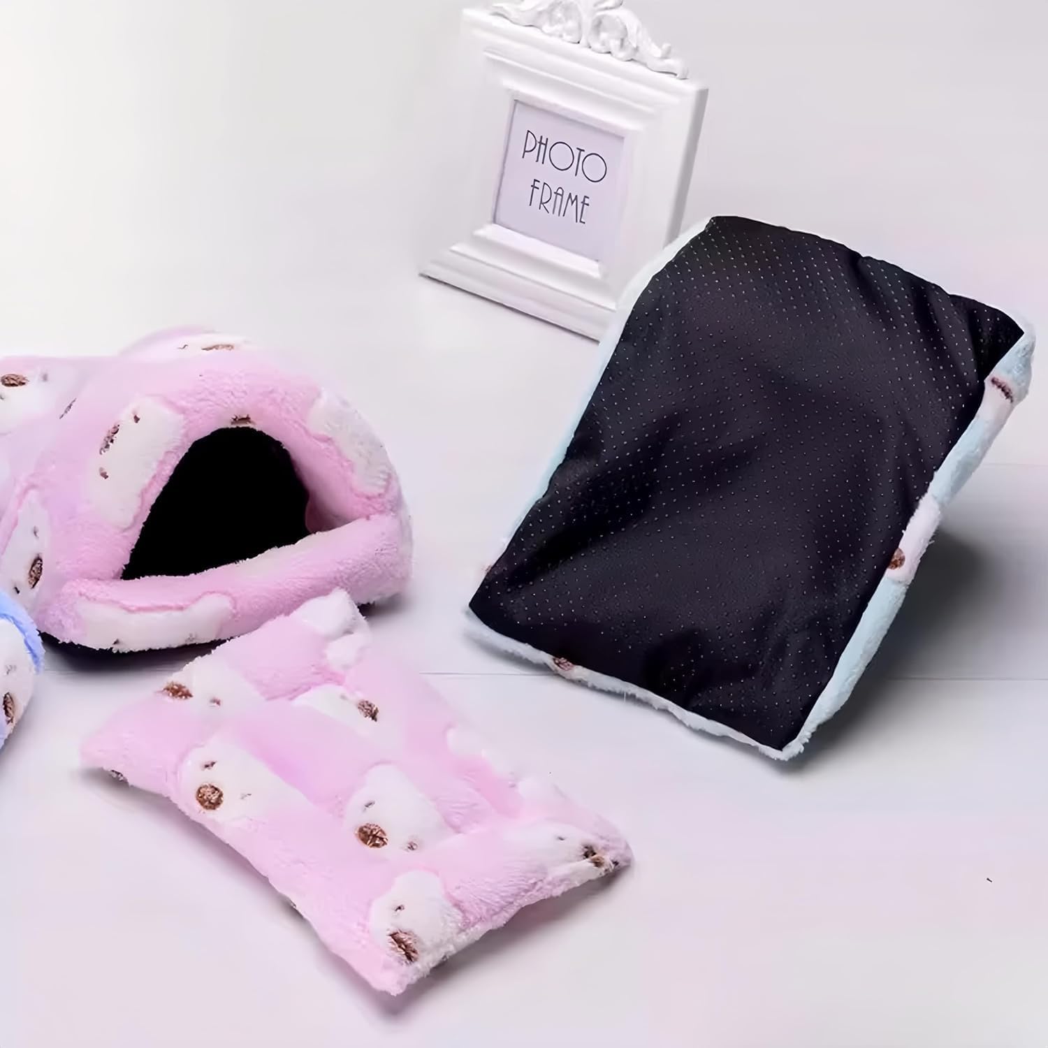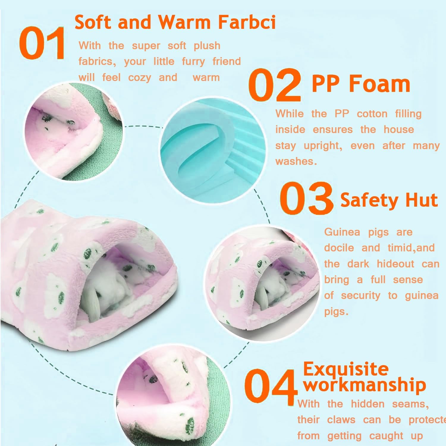 【Material】The guinea pig nest is made of short plush and high-density foam,the inside of the mat is filled with PP cotton, and the bottom has anti-slip particles
