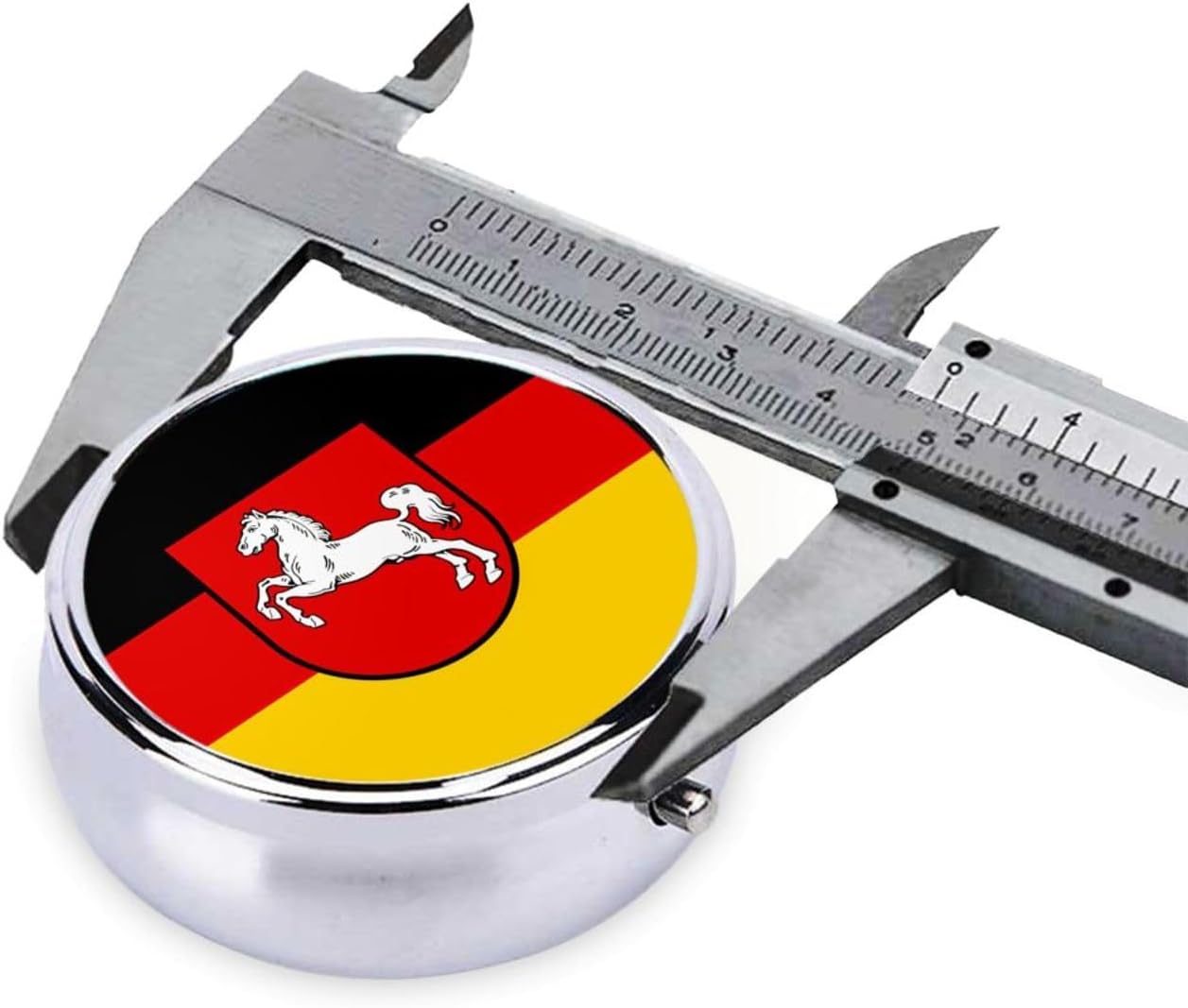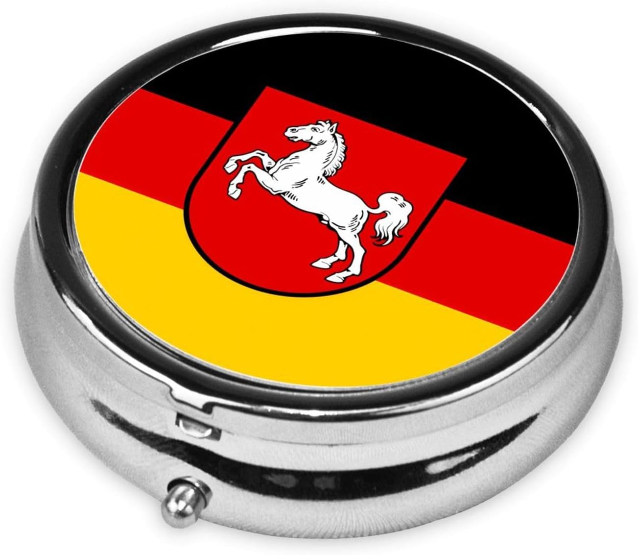 Flag of Lower Saxony Stay organized and stylish with this Round Pill Box – a portable medicine storage container perfect for vitamins, supplements, fish oil, and more. Designed with a full-print exterior, this pill box is not just functional but also a fashionable addition to your daily routine. Made from durable electroplated metal iron, it offers a premium feel and long-lasting performance.