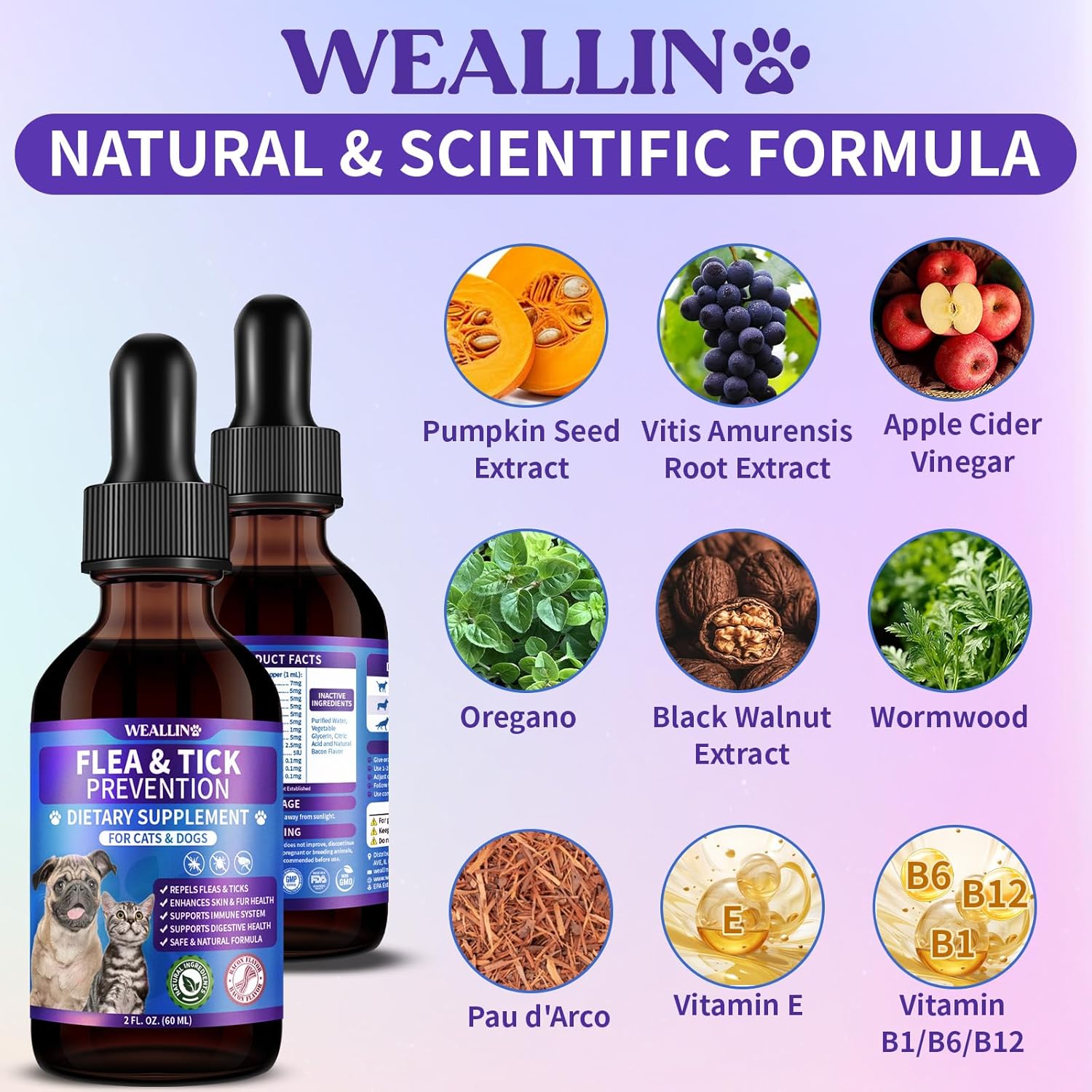 If youâve ever had a pet dealing with fleas, you know itâs a nightmare. I was skeptical about these flea and tick drops, but after a couple of weeks using them, I noticed a huge difference. My dog stopped scratching all day, and his coat started looking healthier too. The stuff smells mild â kind of herbal, not chemical â which made me feel better about using it.The dropper makes it easy to measure and mix into their food. My cat didnât even notice it in her wet food, which is saying something because sheâs picky like a diva. What I love most is that itâs natural ingredients â no weird side effects or greasy residue like those spot-on treatments.It also seems to help with their energy levels. My pets just look and act more comfortable now. Thatâs peace of mind money canât buy.