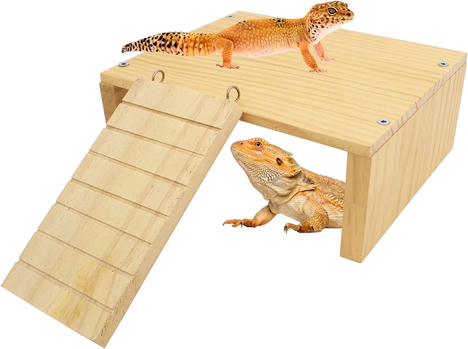 FlidRunest Reptiles Hide, Bearded Dragon Hide Cave with Ladder, Gecko Basking Platform for Tank, Wooden Accessories for Bearded Dragon Lizard Geckos Hamster