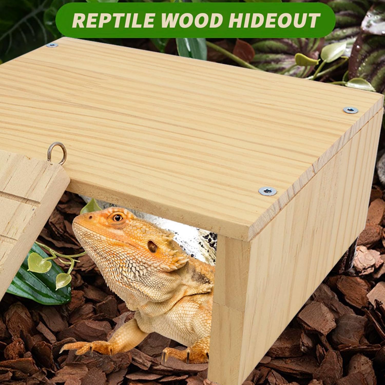 Reptiles Hideout Wooden: Give your reptile comfort and security with the wooden hideout! Reptile hide house is suitable for various reptile such as bearded dragons, lizards, turtles, geckos, hamsters, guinea pigs, chinchillas, chameleons, and more.