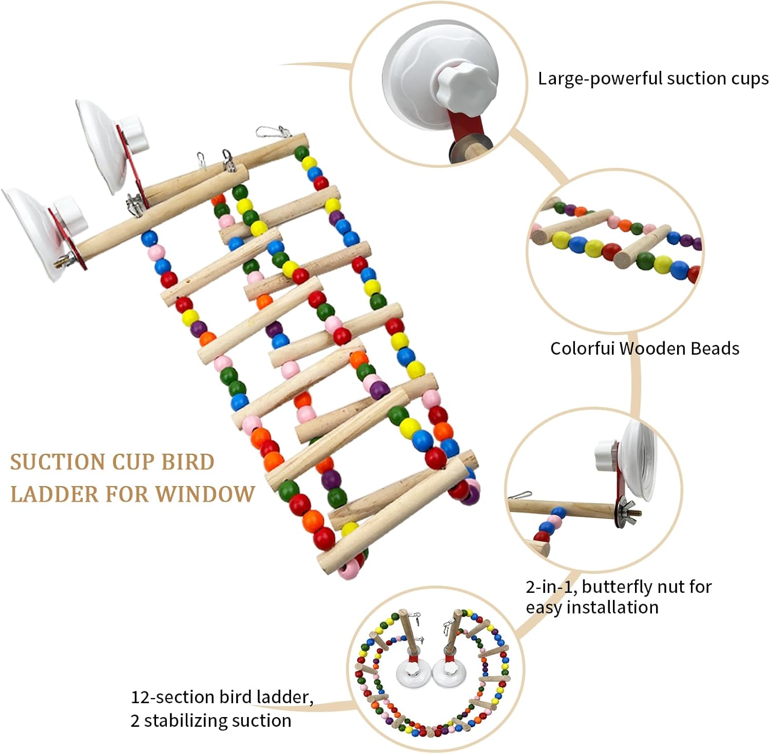FlidRunest Suction Cup Wooden Bird Perch Stand Toy, Colorful Bird Parrot Ladder Bridge Toys for Window/Bath/Car, Climbing Ladder for Parrot, Lovebird, Parakeet, Budgie